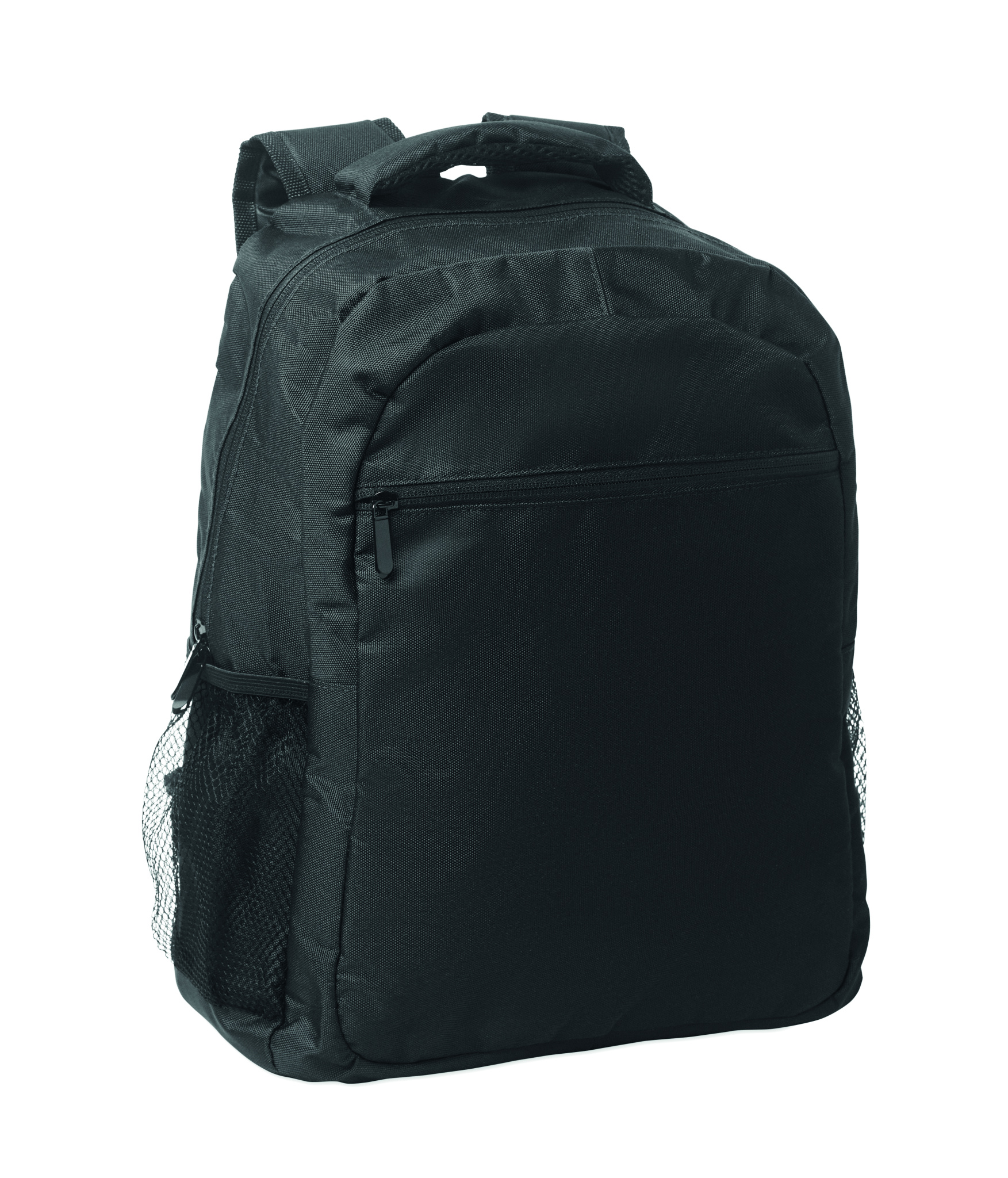 15'' Laptop-Rucksack aus 600D RPET-Polyester mit gepolstertem Laptopfach. Beidseitige Netztaschen und Reißverschlusstasche vorne.