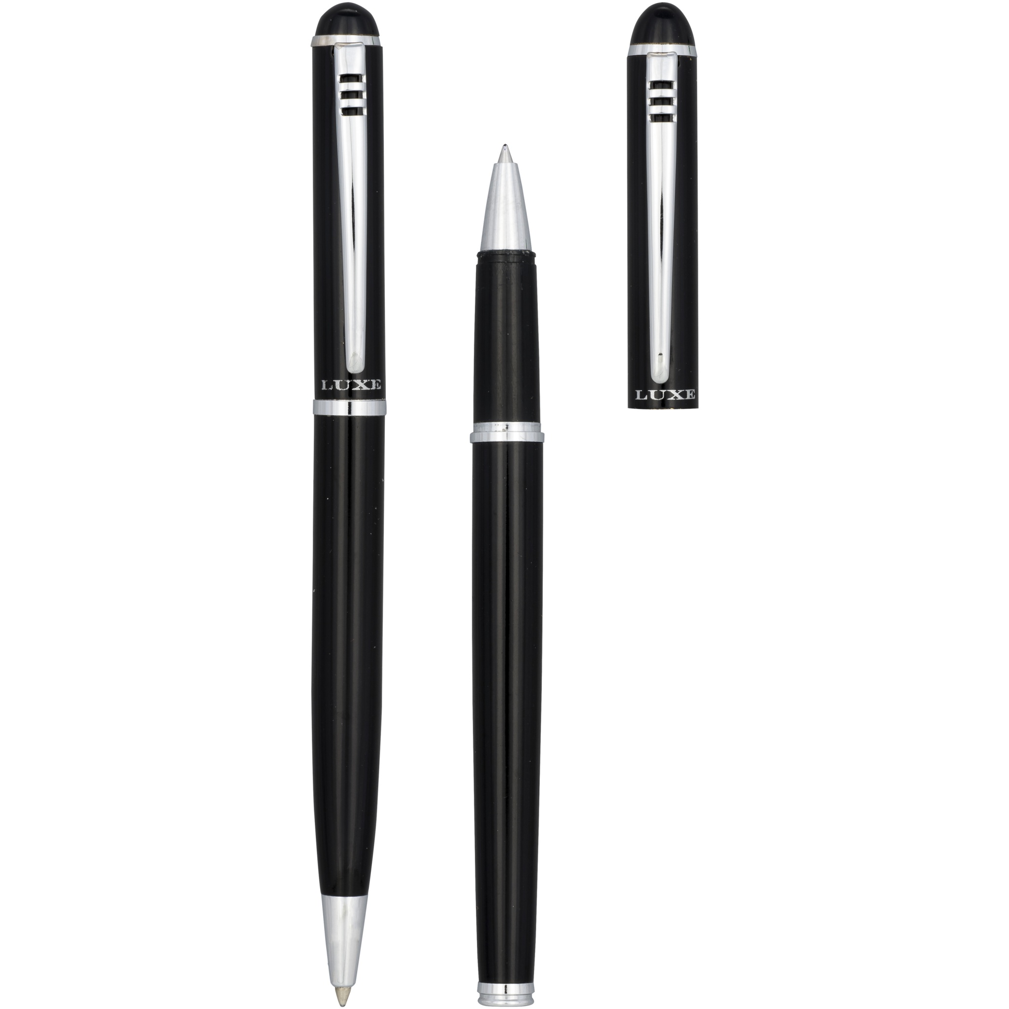 Exklusiv gestaltetes Schreibset aus Kugelschreiber zum Drehen und Tintenroller mit Kappe. Erhältlich in glänzendem Schwarz, mattem Silber und mattem Blau. Verpackt in einer Geschenkbox von LUXE.