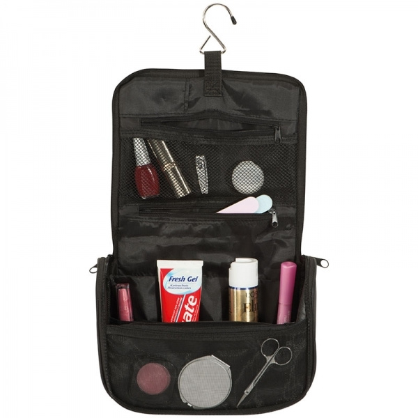 Kulturtasche aus 190T Nylon mit großem Innenfach, 3 Reißverschlussfächern, 4 Gummibändern und Aufhängehaken. Ihre Werbung drucken wir auf die Vorderseite.
