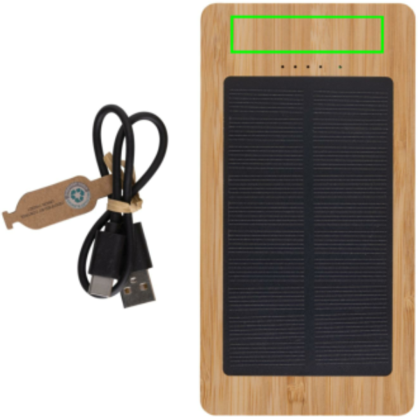 10.000 mAh Solar-Powerbank aus 100% FSC-Bambus. Die Powerbank verwendet hochwertige monokristalline Solarzellen mit einer Umwandlungsrate von 19%. Die Ladegeschwindigkeit hängt von den Umgebungsbedingungen ab. Die Powerbank enthält eine langlebige A-Grade Lithium-Batterie mit 10.000 mAh. Aufladegeschwindigkeit Solar: 5V/180mA. Input Type-C: 5V/2A. Output: USB-A: 5V/2A; Type-C: 5V/2A. Artikel und Zubehör PVC-frei. Inklusive RCS-zertifiziertem recyceltem TPE-Ladekabel. Verpackt in FSC®-Mix-Verpackung.
