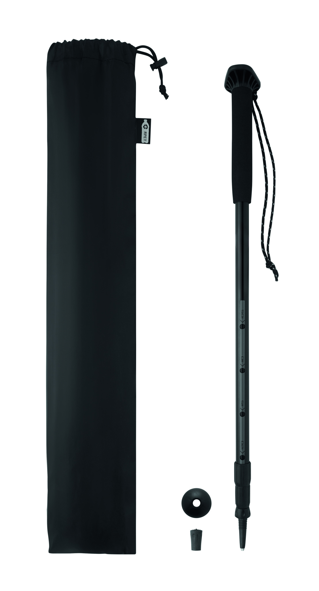 Teleskop-Wanderstock mit EVA-Griff, Handgelenkschlaufe, Gummispitze und Schlammteller. Einstellbare Länge: 105 bis 120 cm. Lieferung in RPET-Beutel mit Kordelzug.