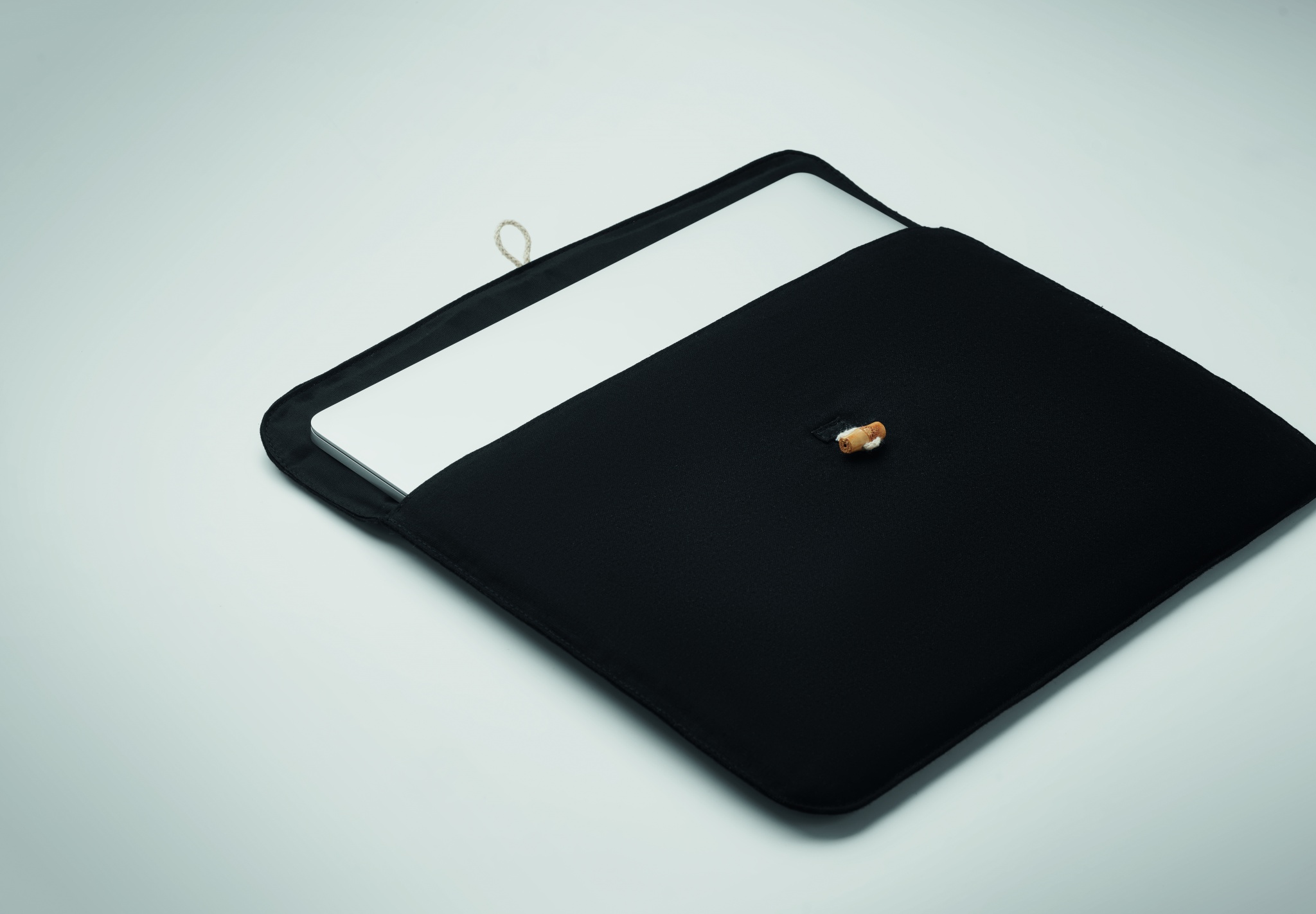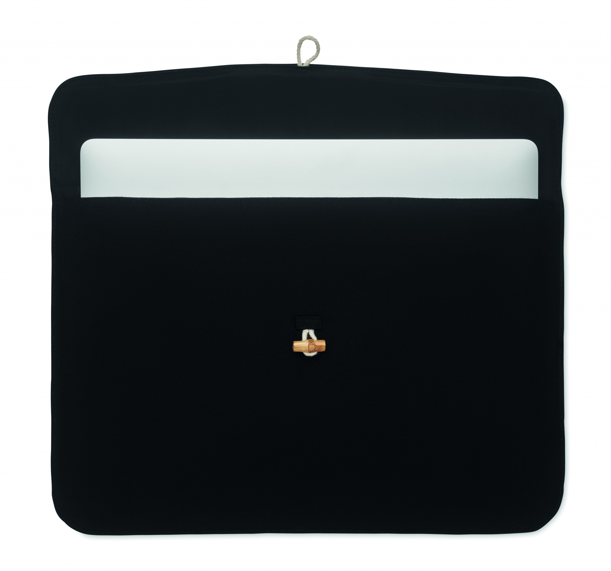 15 inch padded laptop pouch in 220 gr/m² cotton. Inner lining 120 gr/m². Bamboo button closure.