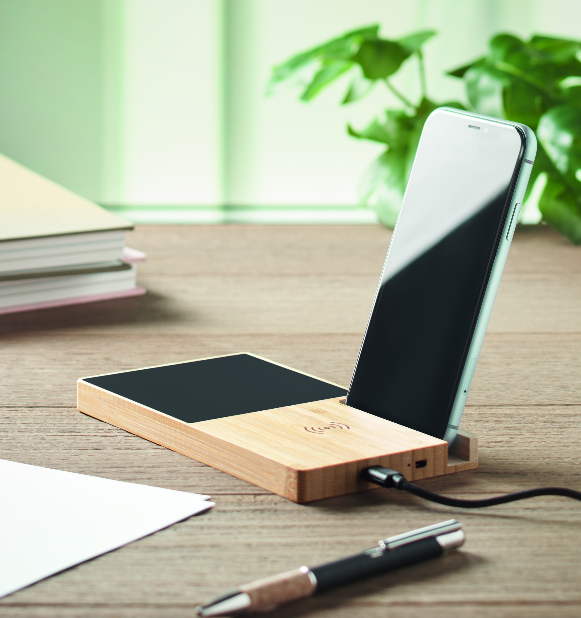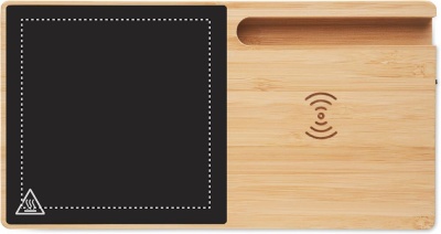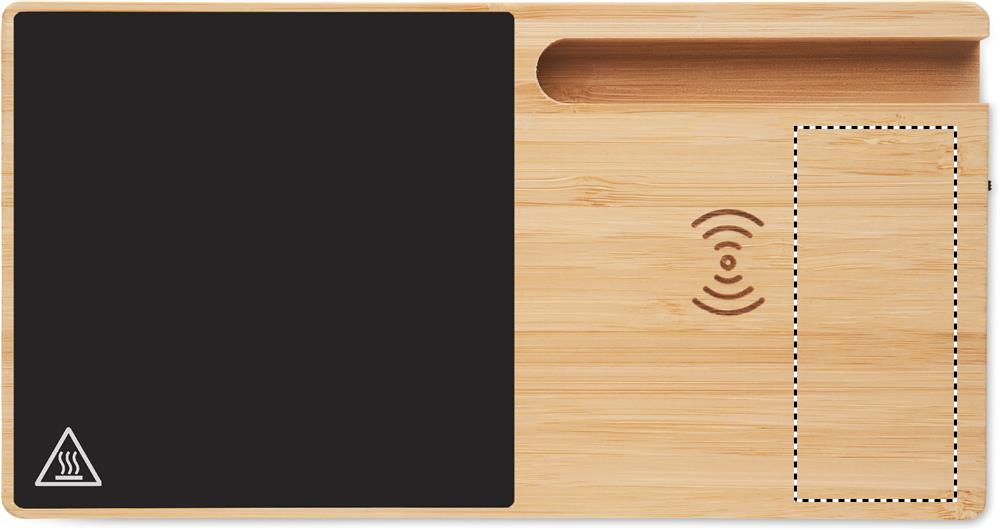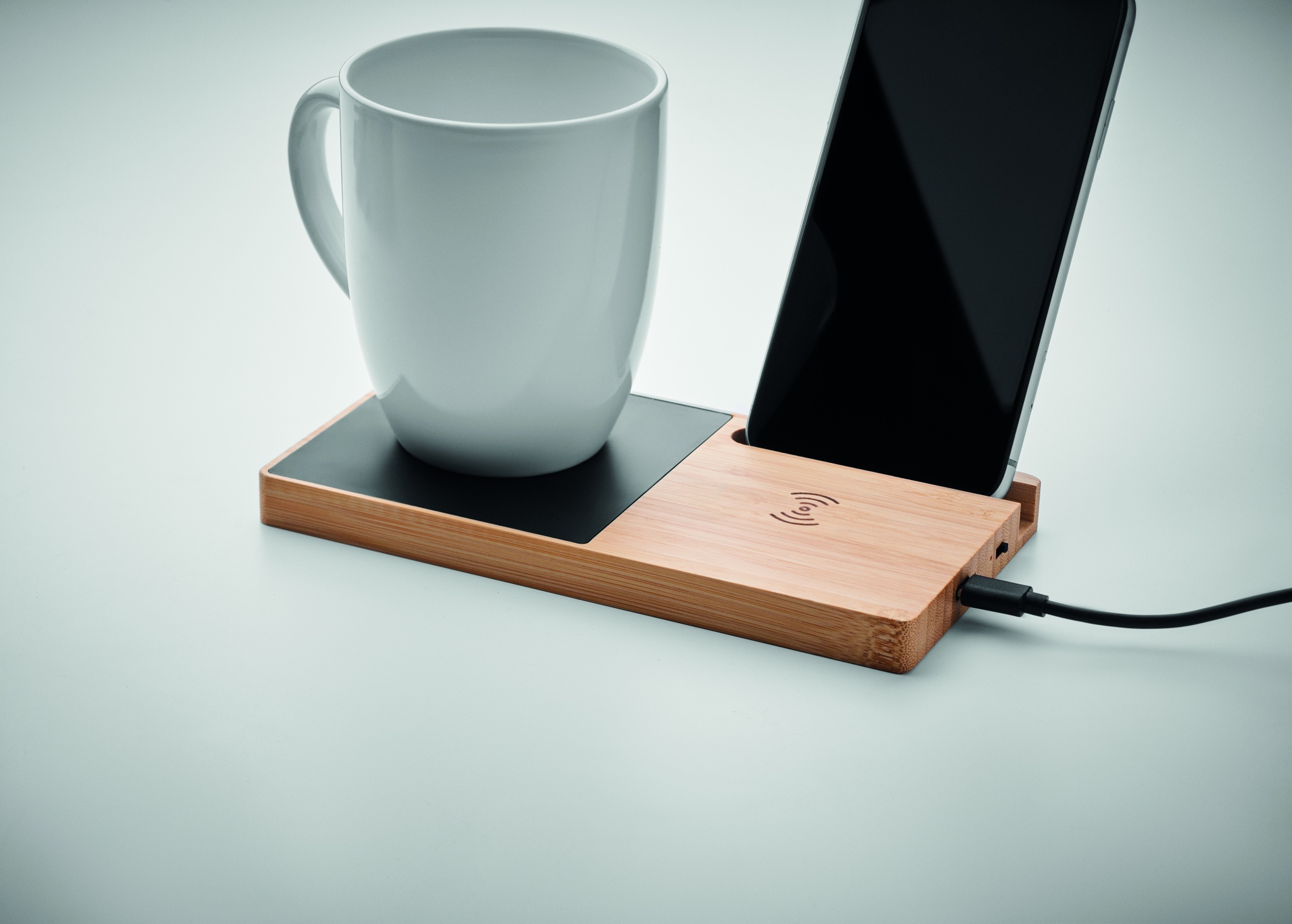Wireless charger in bamboo including a mug warmer and phone stand. Connect device to your computer, place smartphone on it and allow it to charge. Output: DC 9V/1.67A (15W). Compatible with all QI enabled devices such as latest Androids, iPhone® 8, X and newer.