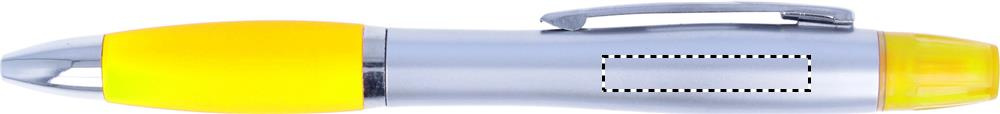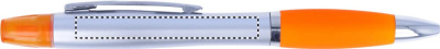 2 in 1 plastic ball pen and highlighter in silver satin finish and chromed fittings. Blue ink.