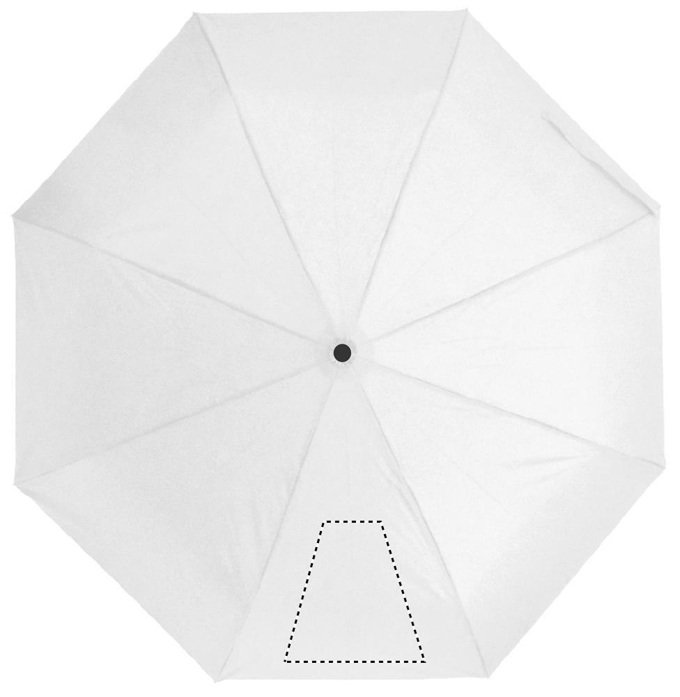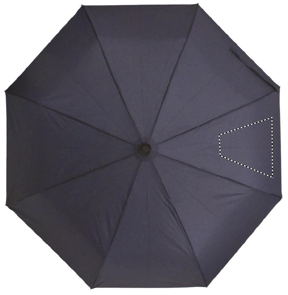 Foldable 21 inch umbrella, 3 sections with 190T RPET pongee fabric, black plated frame and ribs with wooden handle. Manual open and closure. Self material pouch.