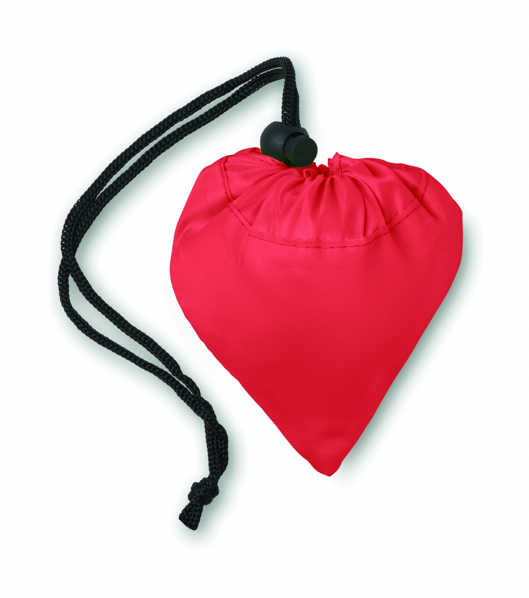 Foldable shopping bag in 210D polyester with drawstring closure on pouch.