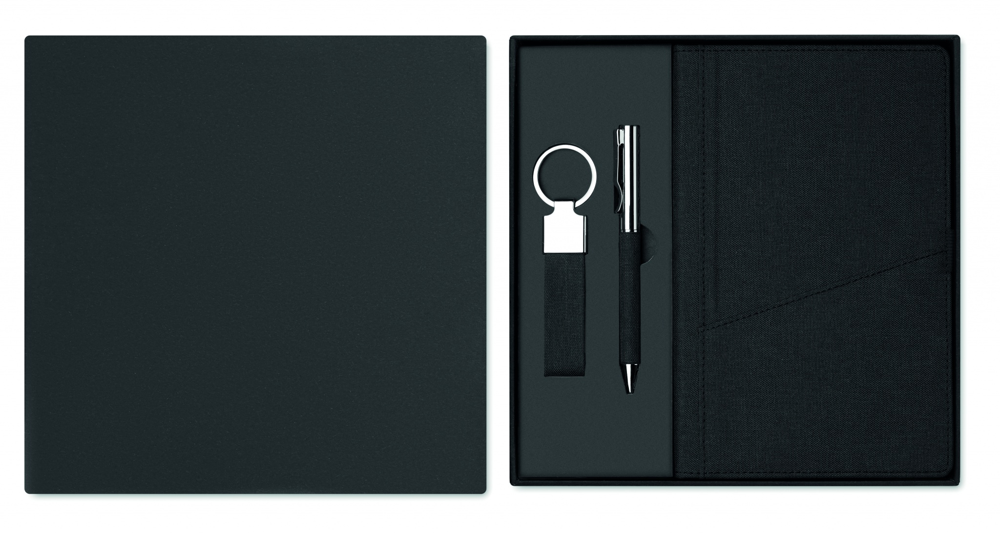 3 piece gift set in gift box. Including metal twist ball pen with RPET polyester detail, RPET hard cover notebook with front smartphone pocket, and RPET polyester keyring. Blue ink.
