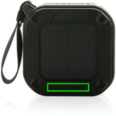 Powerful 3W wireless speaker with integrated solar panel on the back made with RCS certified recycled ABS. Total recycled content: 38% based on total item weight. RCS certification ensures a completely certified supply chain of the recycled materials. The speaker uses high quality monocrystalline solar panels with 19% conversion rate. Charge rate depends on conditions. Charging speed solar: 5V/80mA. The speaker is equipped with a 400 mAh battery to ensure up to 5 hours of playing time and BT5.3 for smooth connection and clear sound. Connection range up to 10 metres. With mic and pick up function to answer calls. With integrated 30 lumen LED light. Packed in FSC mix FSC® box. Including RCS certified recycled TPE charging cable. Item and accessories 100% PVC free. IPX 5 waterproof.