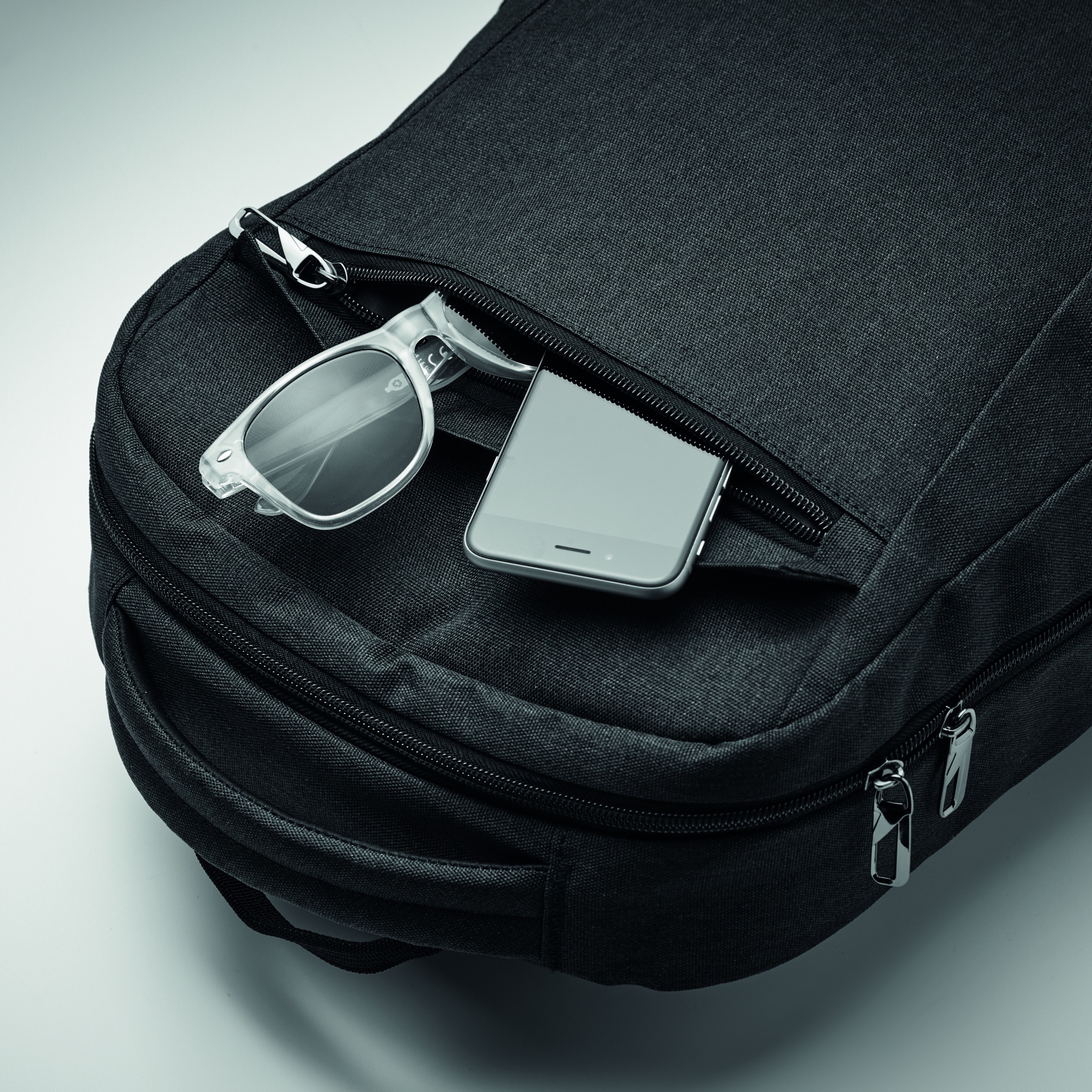 15 inch laptop backpack in 600D RPET polyester. Internal laptop compartment and several small inner compartments. It has a front zippered pocket and 2 side mesh pockets. Adjustable shoulder straps. Trolley holder on reverse side.