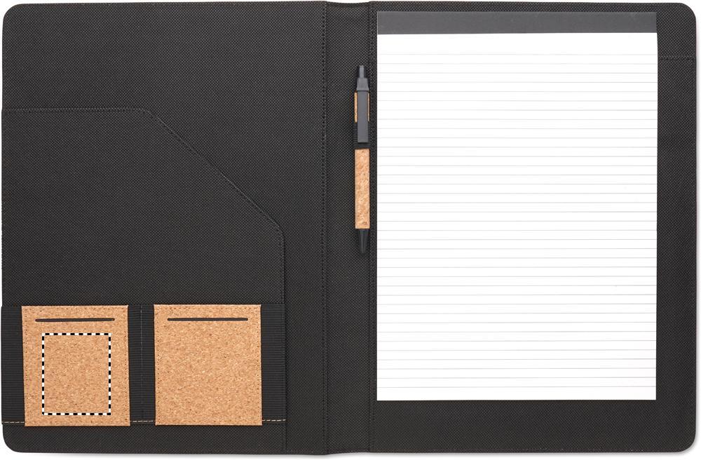 A4 cork conference folder. Refillable A4 notepad. 30 recycled paper lined sheets. Matching pen and pen holder. 2 card holders and one large compartment.