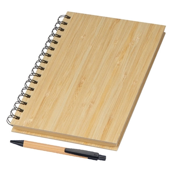 Chic eco set consisting of a DIN A5 notebook with a bamboo cover, spiral binding and 160 lined pages made of recycled paper as well as a bamboo ballpoint pen with a blue plastic refill and plastic applications. We will engrave your logo on the outside of the notebook cover.