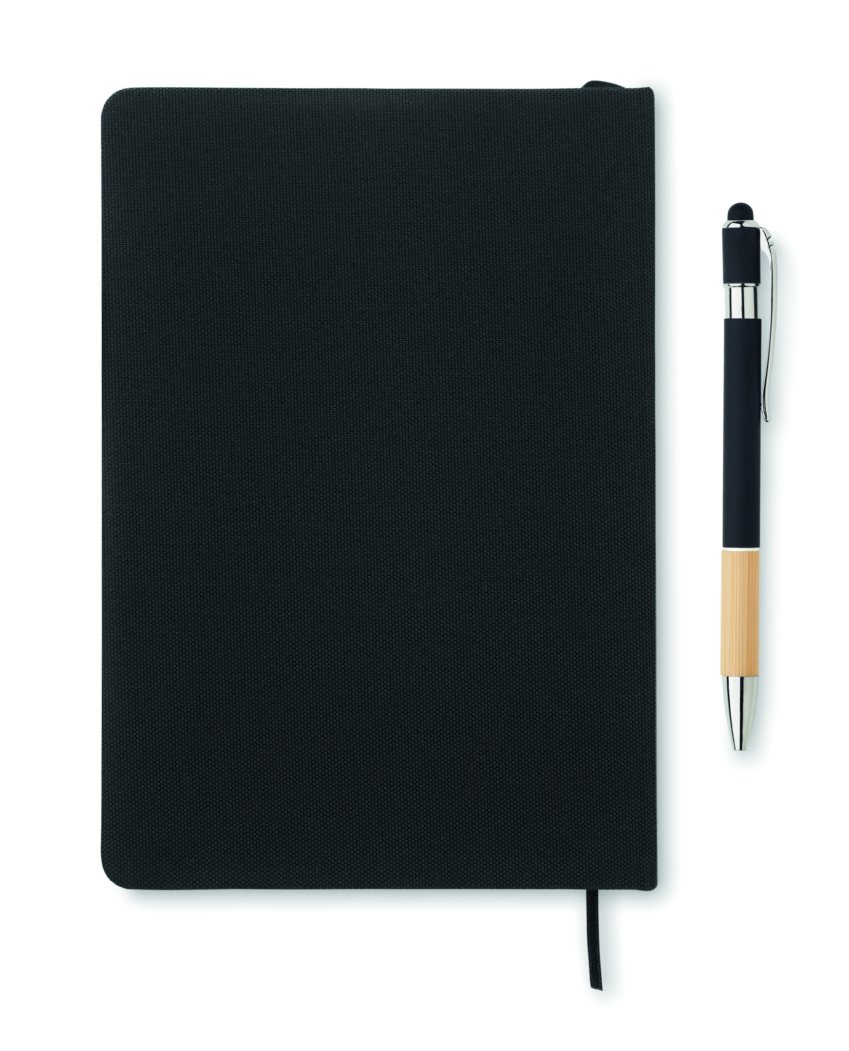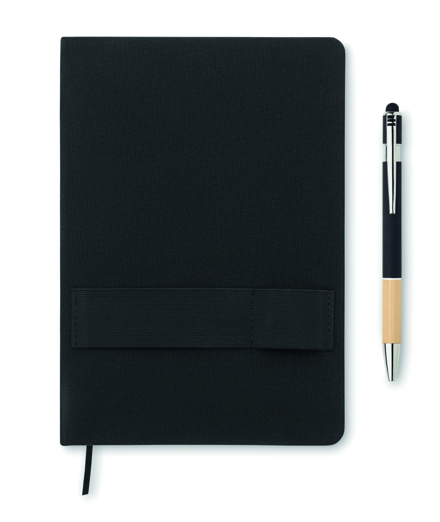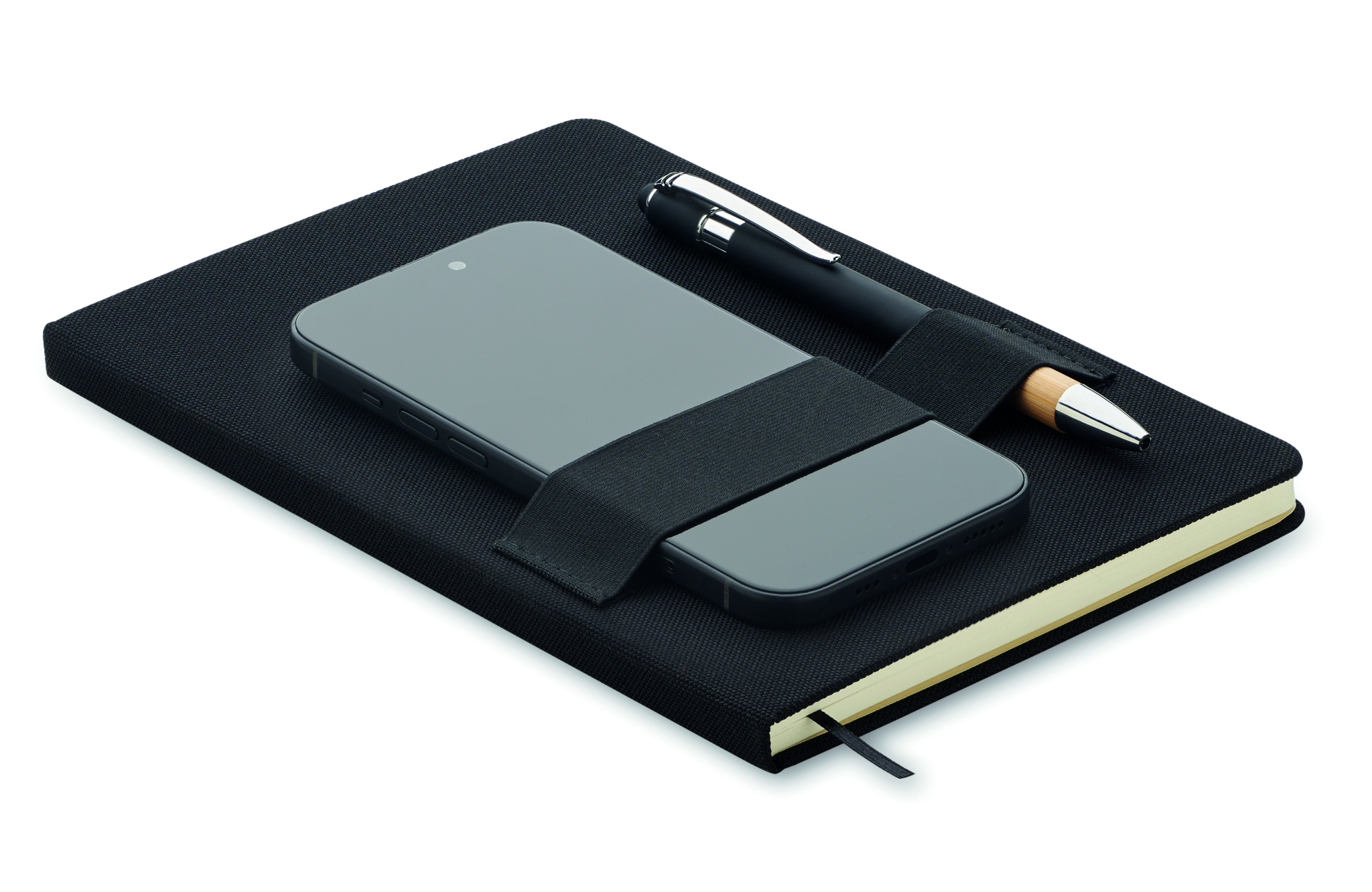 A5 notebook set with 600D RPET hard cover. Front elastic band phone holder function and front pen loop with push ball pen with bamboo grip detail. Case bound. 160 recycled paper lined pages (80 sheets). Includes envelope inside the back cover. Elastic closure strap. Ribbon bookmark. Blue ink.