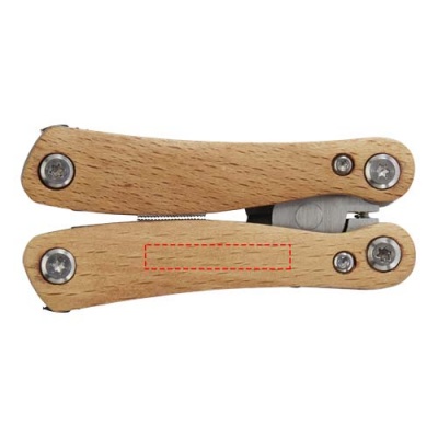Strong and durable compact multi-tool made from high quality stainless steel with handles made of beech wood. This is a must-have tool for any scout, handy man, and outdoor enthusiast. Includes 12 functions: large nose pliers, standard pliers, wire cutter, serrated blade, bottle/can opener, flat screwdriver, medium flat screwdriver, small knife, philips screwdriver, medium knife and file, and file cleaner. The beech wood used is from sustainable, environmentally and socially responsible sources. The size when opened is 11 x 6 cm, and when closed 7.2 x 3.4 cm. Comes with an instruction manual and is packed in a recycled cardboard gift box with a size of 9.5 x 5.5 x 2.5 cm. Laser engraving is recommended as a sustainable decoration option.