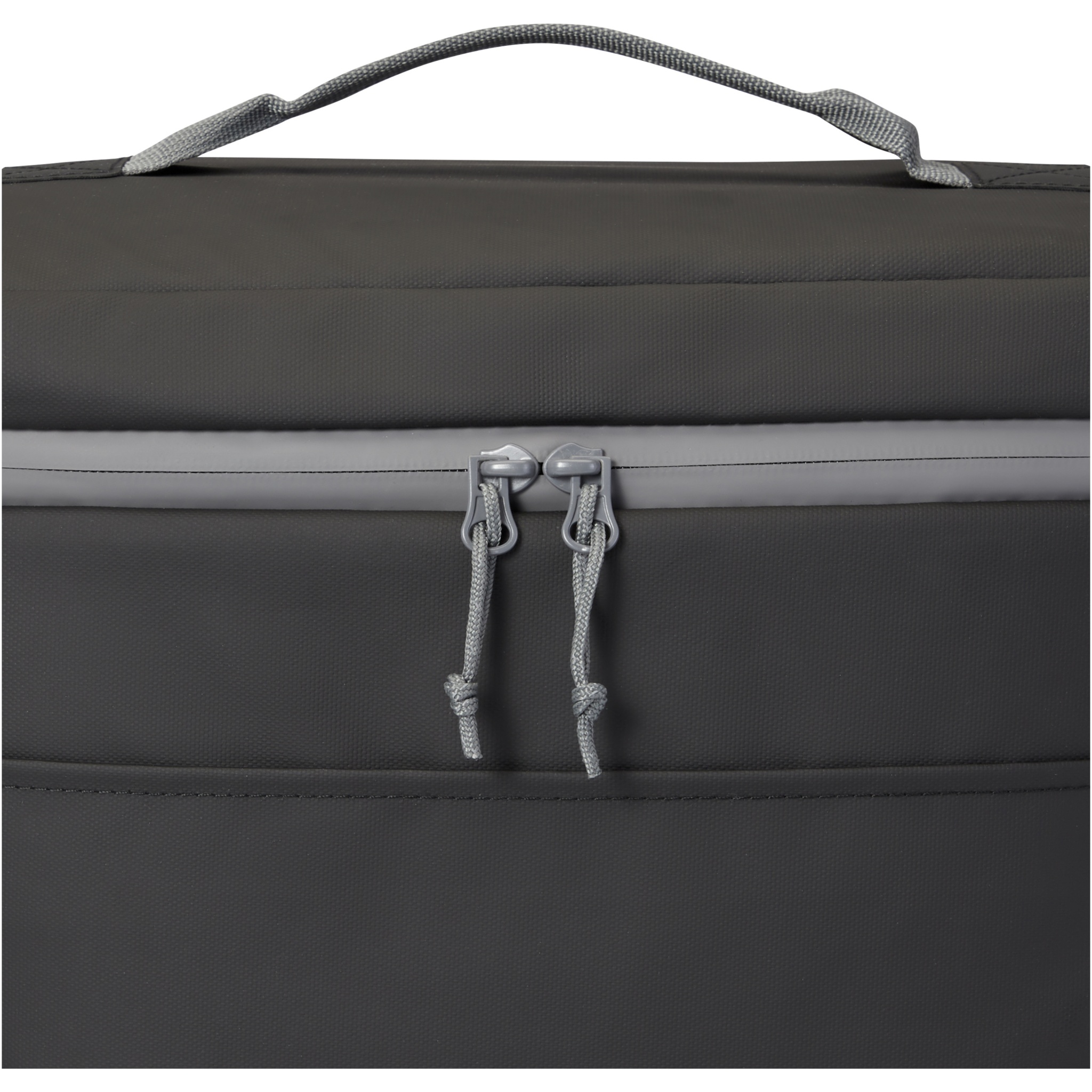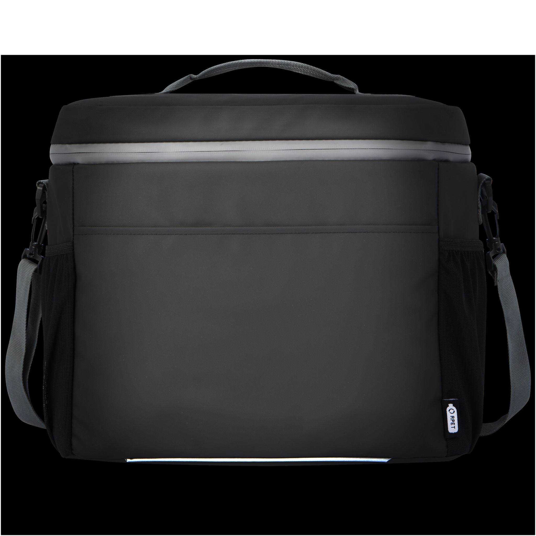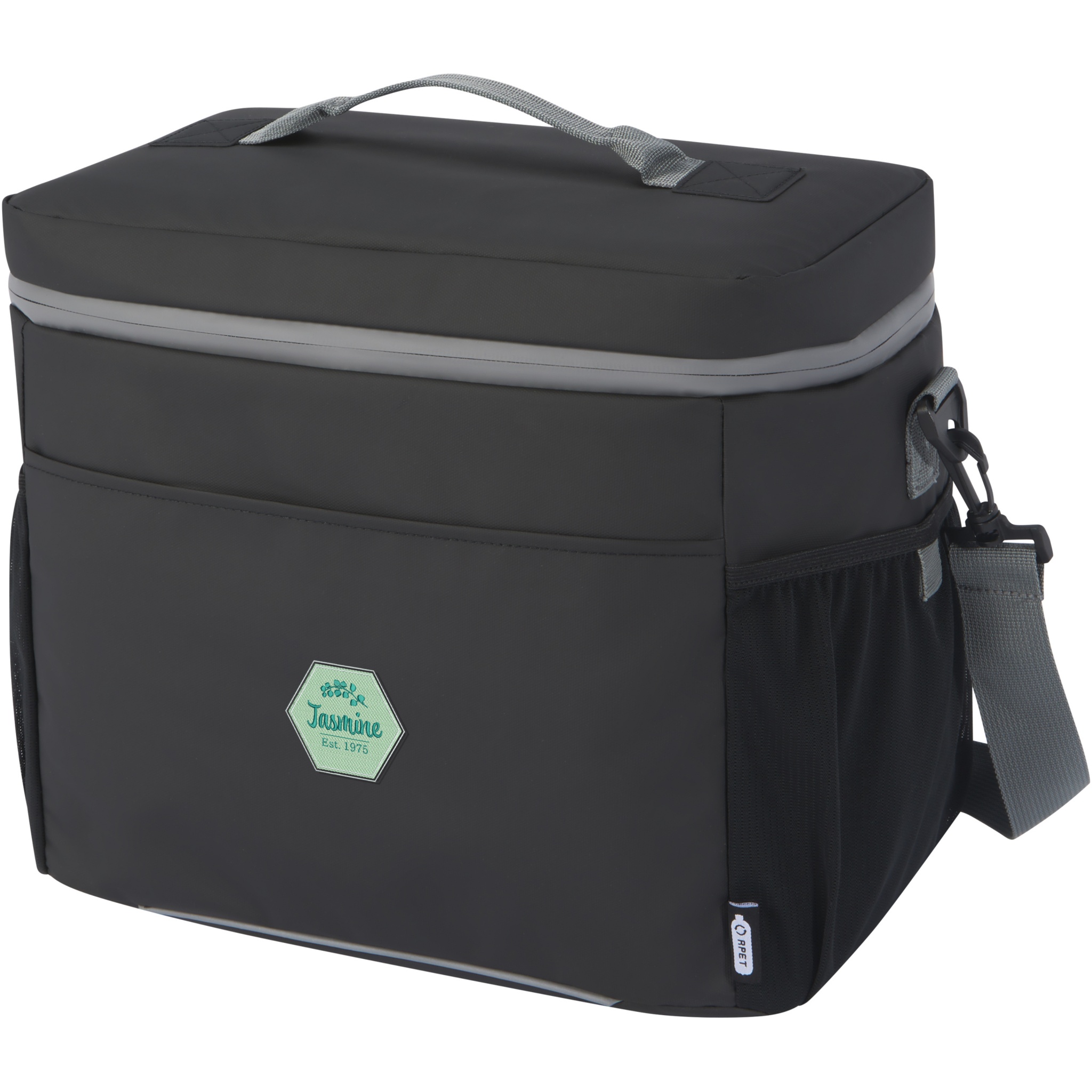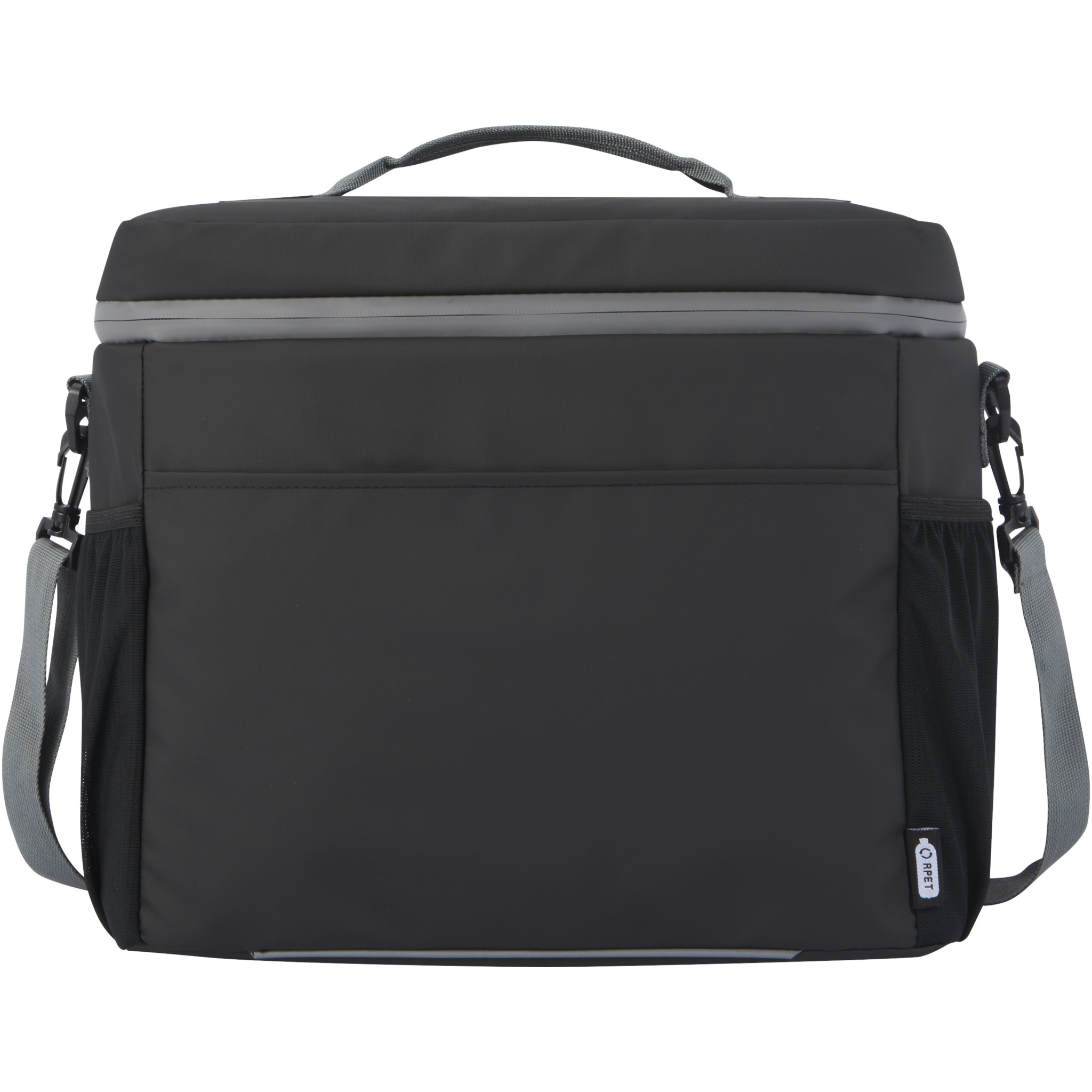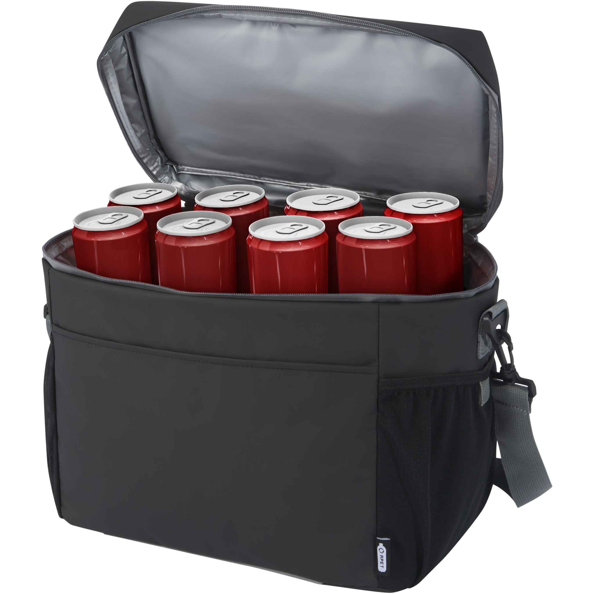 Water-resistant 20-can cooler bag made from GRS certified recycled materials, including the zips. It features a spacious zippered compartment lined with food-safe and extra thick high density thermal PEVA and foam insulation, keeping beverages and refreshments cold for hours. It also has 2 mesh pockets and one open front pocket for additional storage. The webbing carrying handle and the adjustable and padded shoulder strap makes it comfortable to carry around. The GRS recycled materials include the main fabric, lining, webbing, and zips. Capacity: 22 litres. PVC free.
