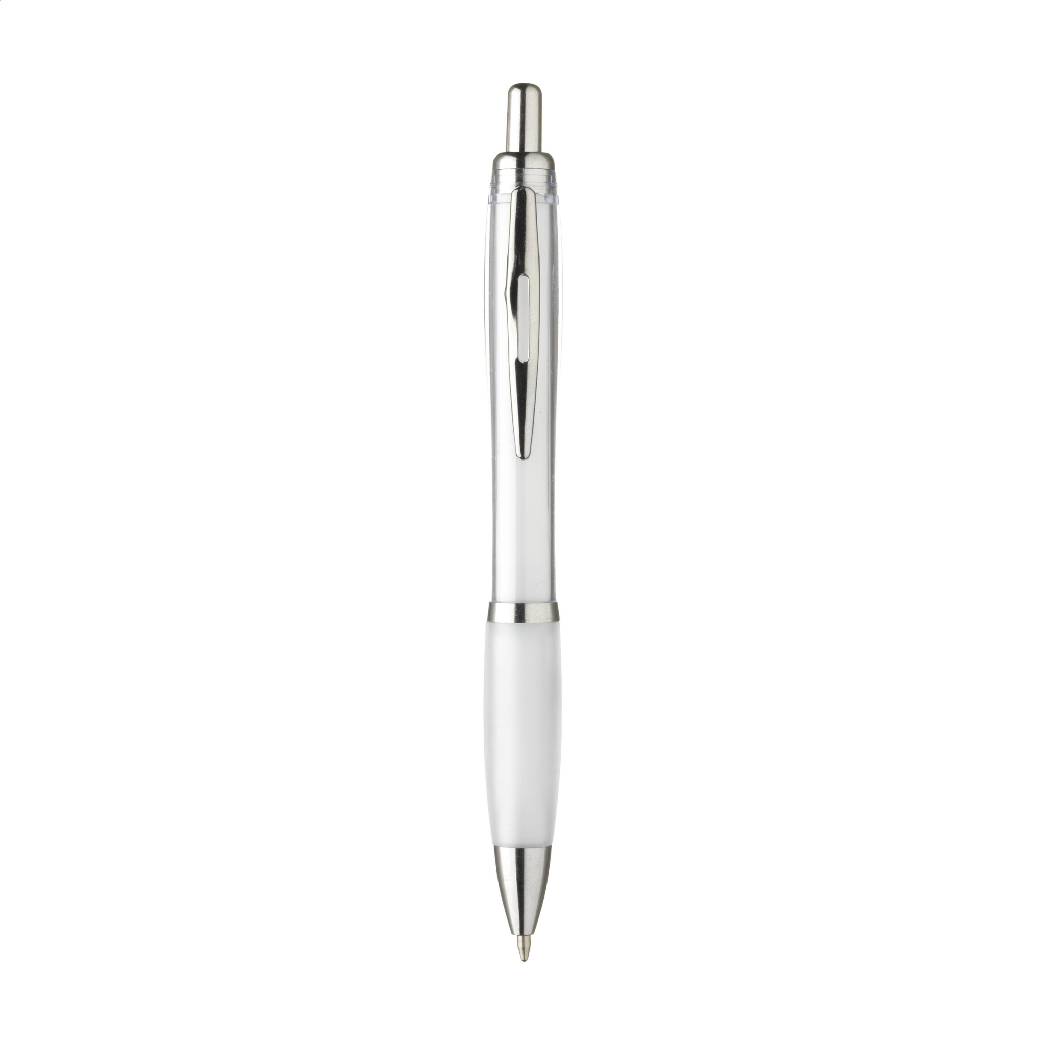 Blue or black ink ballpoint pen with transparant coloured barrel, non-slip grip and metal clip.