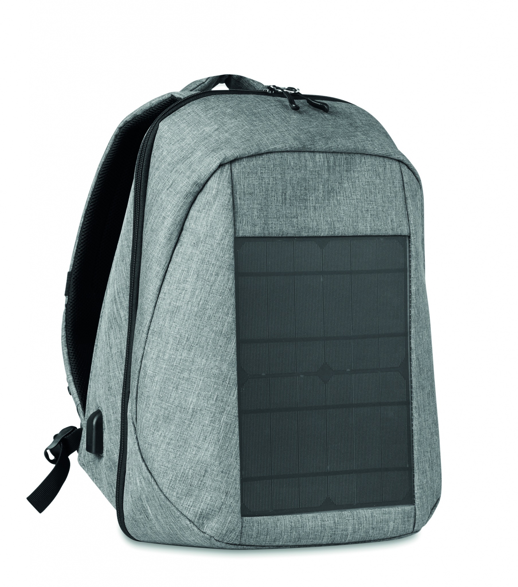 2 tone 600D Polyester backpack with built-in 10W solar panel charger with USB port and cable. Charging time telephone is about 5-6 hours in the direct sun. 2 main compartments. Several inside pockets Includes one internal 13 inch laptop compartment. Padded back and shoulder straps. Additional pocket for Tablet compartment.