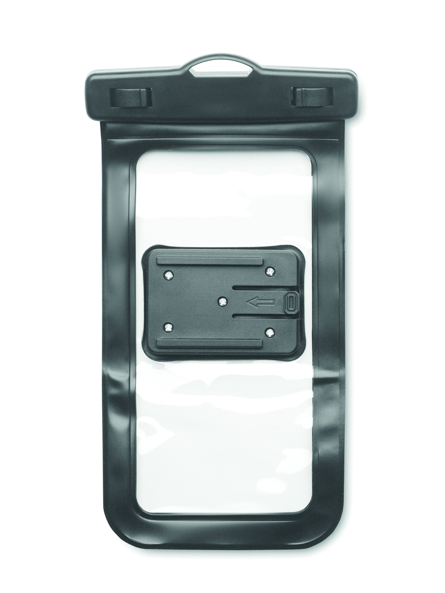 Waterproof bike mobile phone mount case in PVC, rotates through 360 degrees. Waterproof rating: IPX 6. Fits for 6,7 inch size.