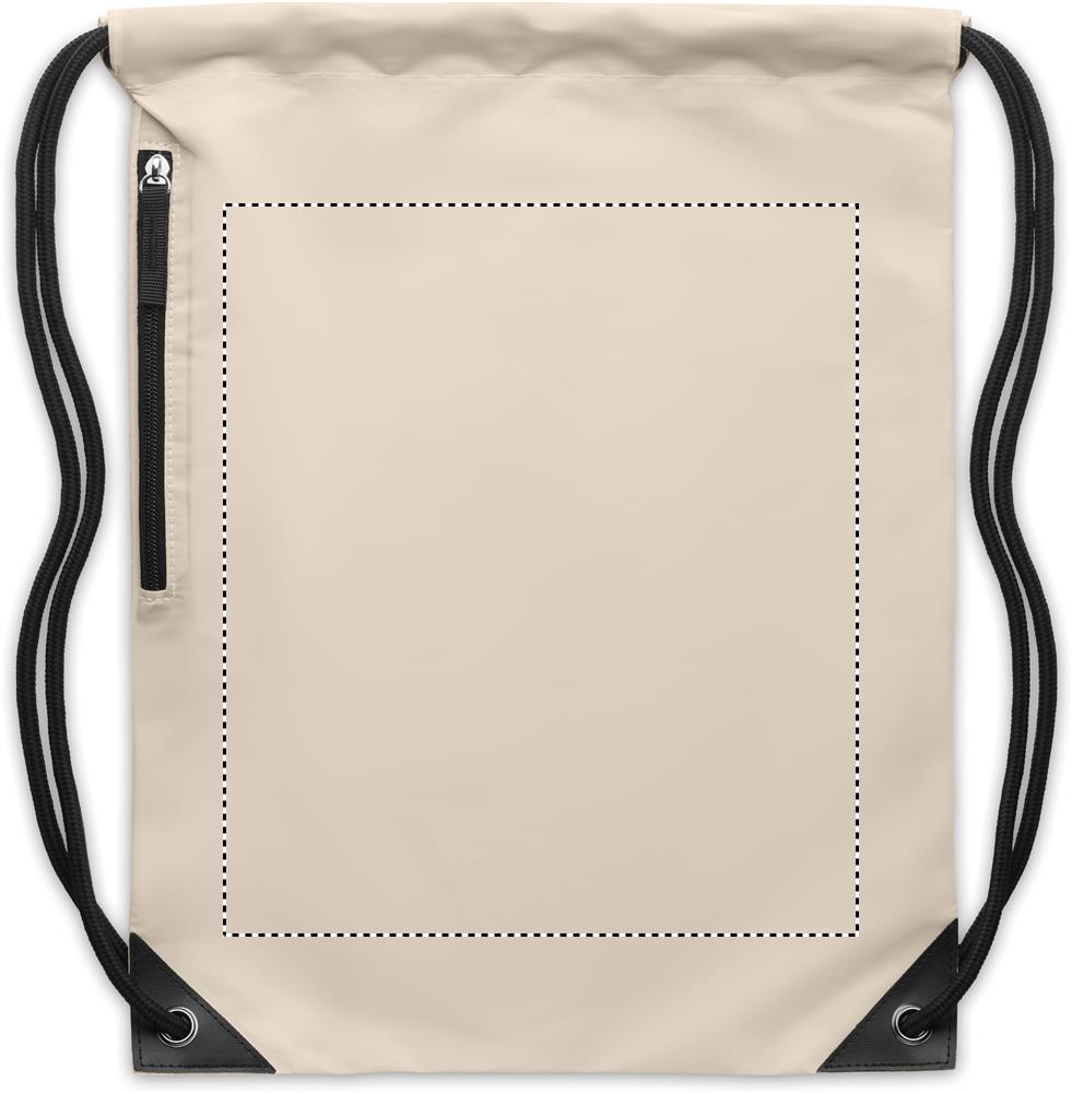 Drawstring bag in 190T polyester coated with with reflective granules. Includes zippered pocket on one side. Thick cord.