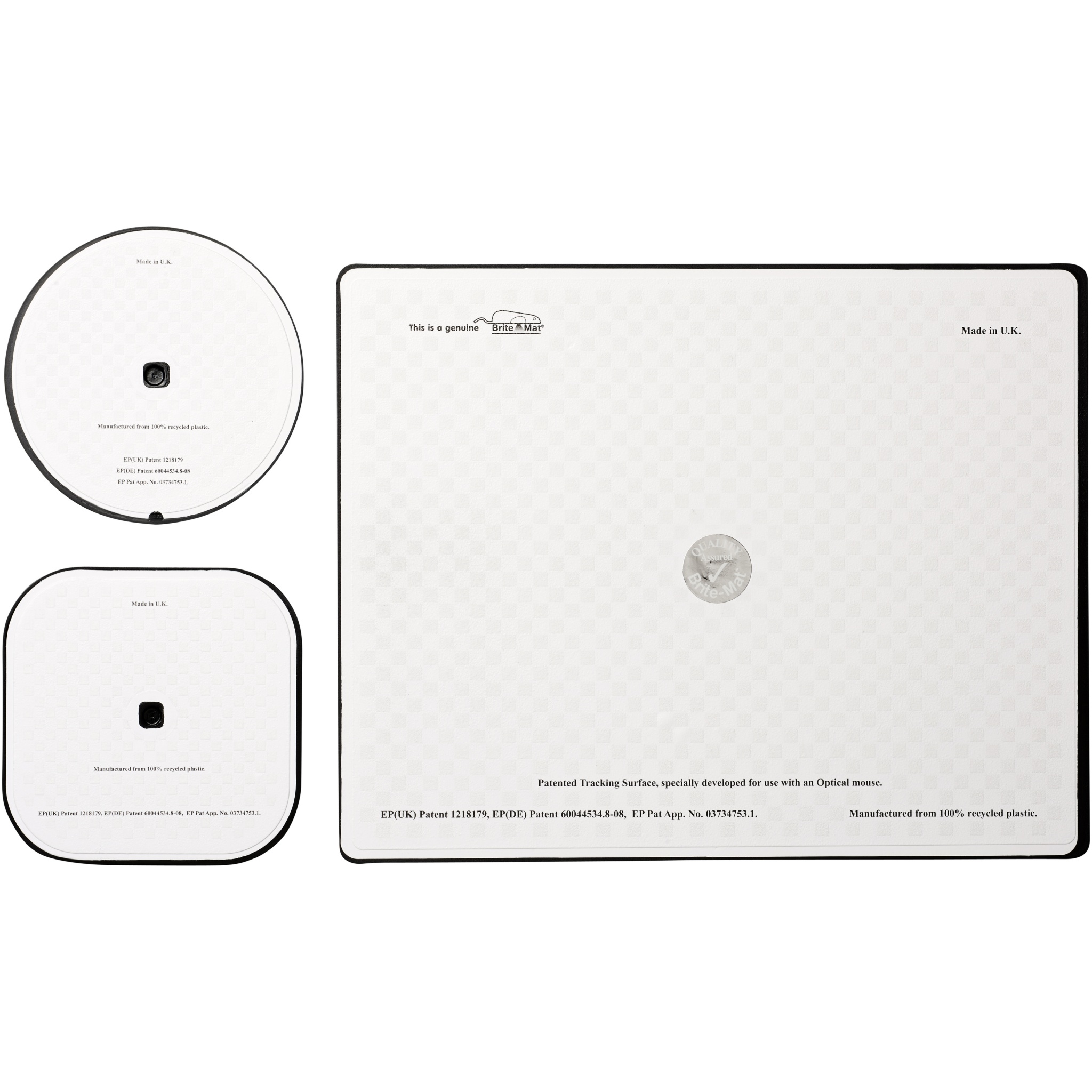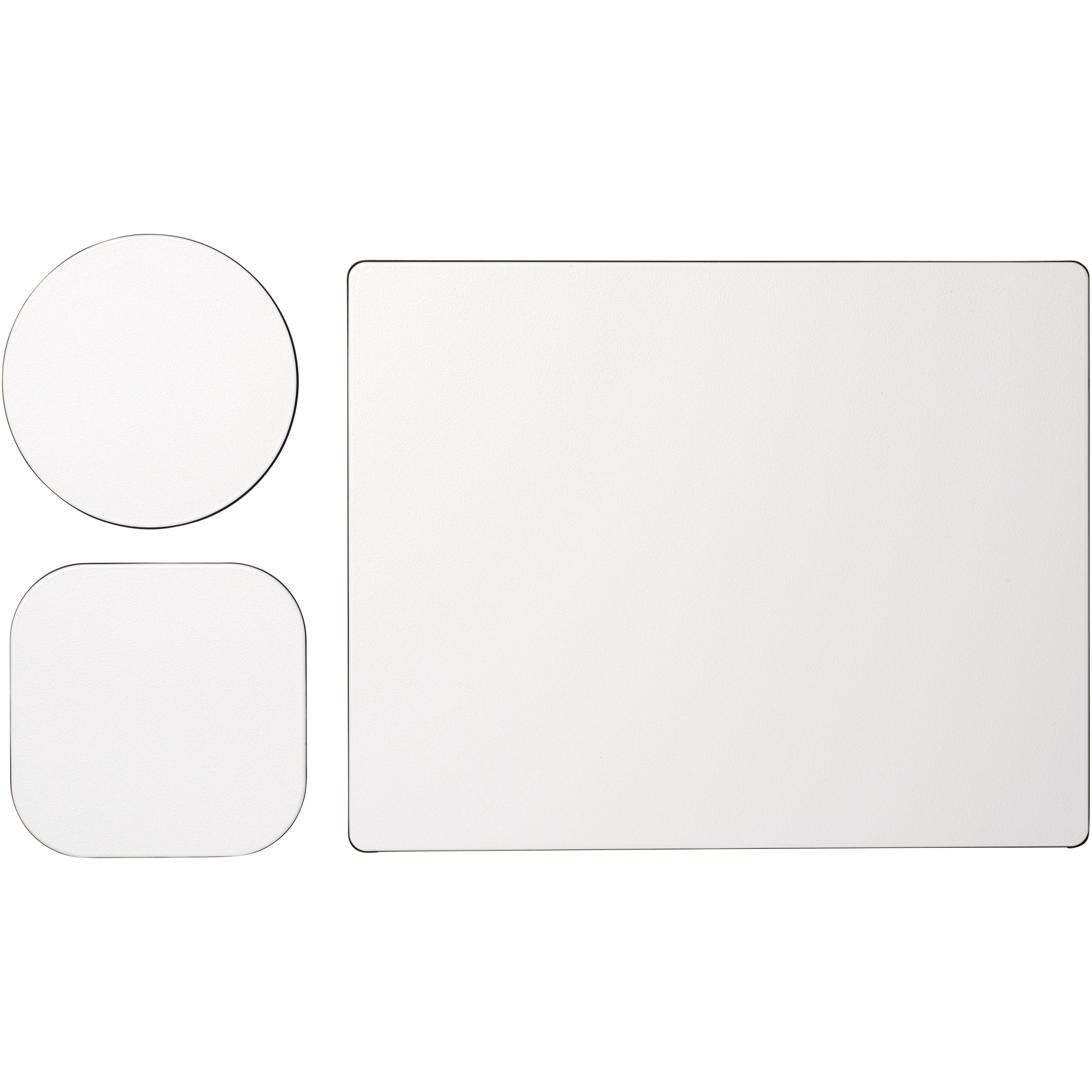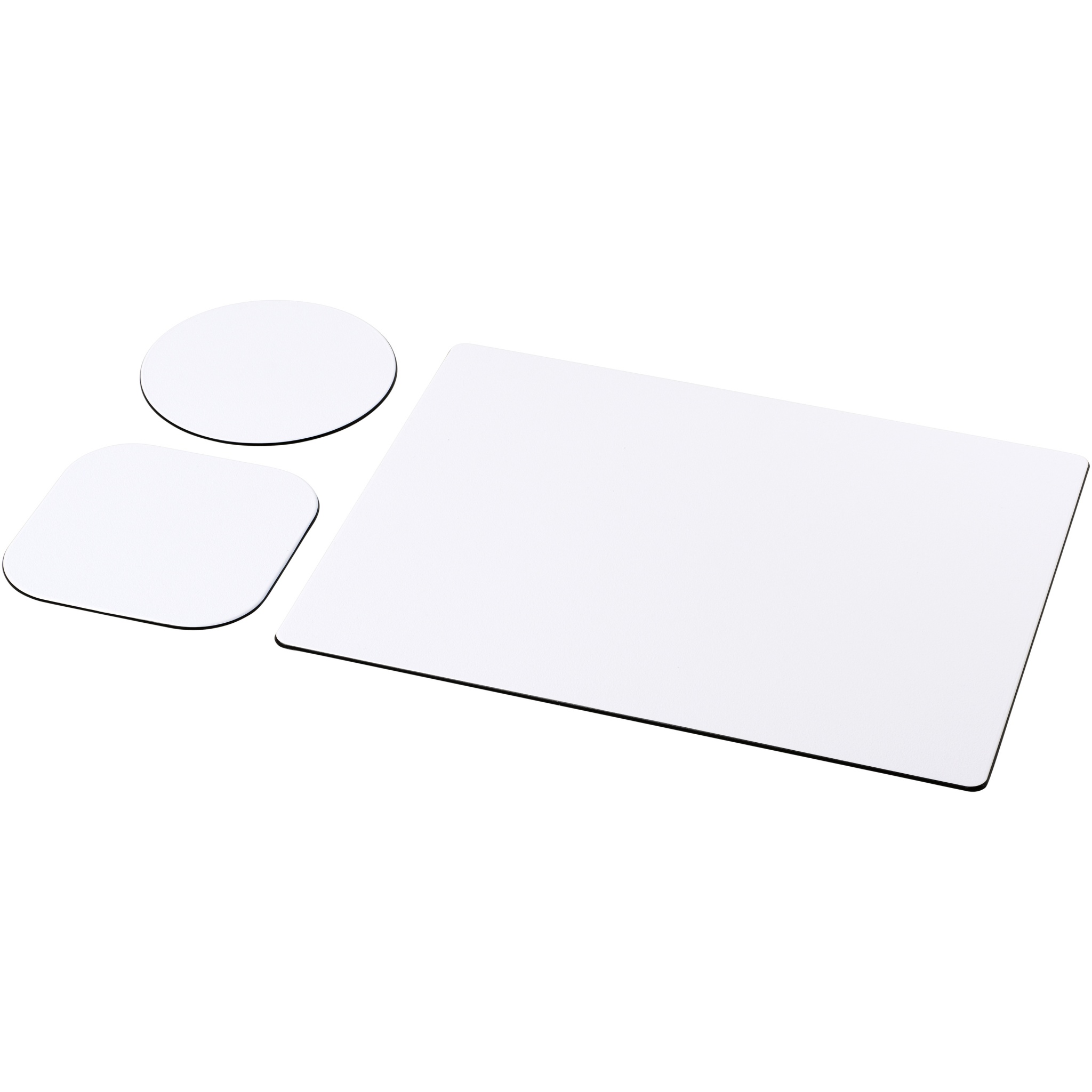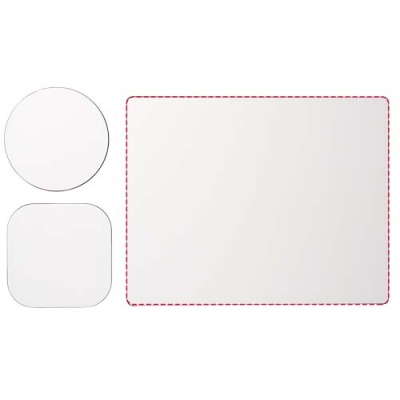 Supplied with a Brite-Mat mouse mat and a set of matching coasters. The set comprises of a rectangular mousemat (0.3 x 19 x 21cm), square coaster (0.3 x 9.5 x 9.5 cm) and round coaster ( 0.3 x ø9.5cm).