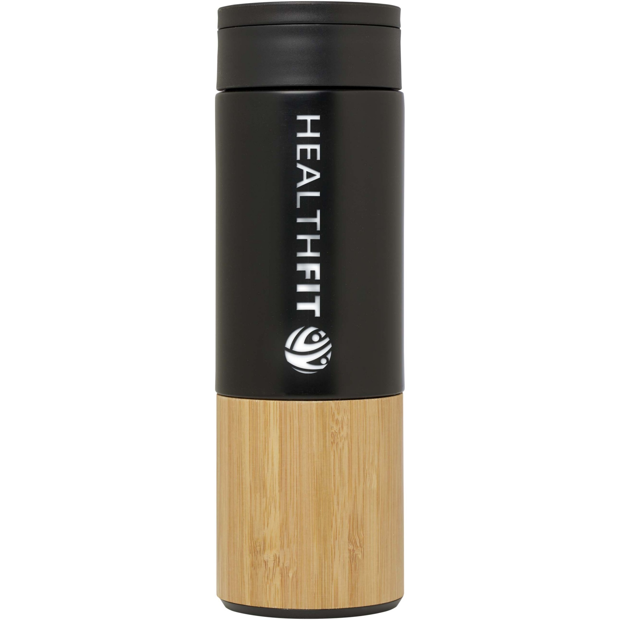 The Carmen gift set includes an A5 hard cover notebook, a ballpoint pen, a water bottle, and an umbrella. The notebook has a black elastic closure and a ribbon marker, and 80 lined cream-coloured sheets of 80 g/m² paper. The notebook cover together with the bamboo semicircle functions as a phone stand. The ballpoint pen is made of RCS certified recycled aluminium with a black spray coating and bamboo grip. Pen ink: Black. Writing length: 1000 metres. The 450 ml water bottle is made of stainless steel with a bamboo accessory at the bottom. Hand wash only. Bottle size: 6.6 x 22.2 cm. The 21" umbrella has a black pongee fabric canopy, black metal shaft, black fiberglass ribs, and a bamboo handle. Umbrella size: 28.3 x 5.5cm. Gift box size: 36 x 30 x 8 cm.