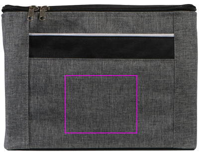 300D+600D polyester cooler bag with carrying handle, zipper closure, space for six 500ml cans or bottles and a front compartment printed with your logo.