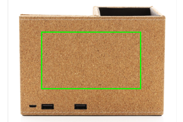 5W wireless charger stand with pen holder made from natural cork. With 150 cm wheat straw (15%) mixed with micro tpe cable. Compatible with all QI enabled devices like Android latest generation, iPhone 8 and up. On the reverse side there are two USB A output ports for charging via cable. Input: 5V/2A; Wireless Output: 5/1A - 5W. 2x USB Output 5V/2A; Item and accessories 100% PVC free.