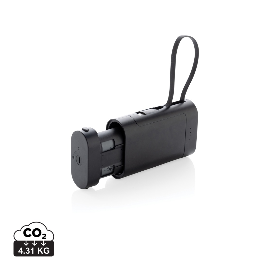 Unique design powerbank that is designed to stimulate recycling of the battery at the end of the products life cycle. Simply open the powerbank and remove the a-grade battery for safe and responsible battery recycling. The 10,000 mah powerbank comes with an integrated type C cable that you can easily connect to your device to start charging direct. The cable can also be used to charge the powerbank itself. With one additional type C port to connect your own charging cable. Made with recycled ABS and recycled TPE. Total recycled content: 30% based on total item weight. RCS certification ensures a completely certified supply chain of the recycled materials. Packed in FSC® kraft packaging. PVC Free. Input: 5V/2.1A Output 5V/2.4A.