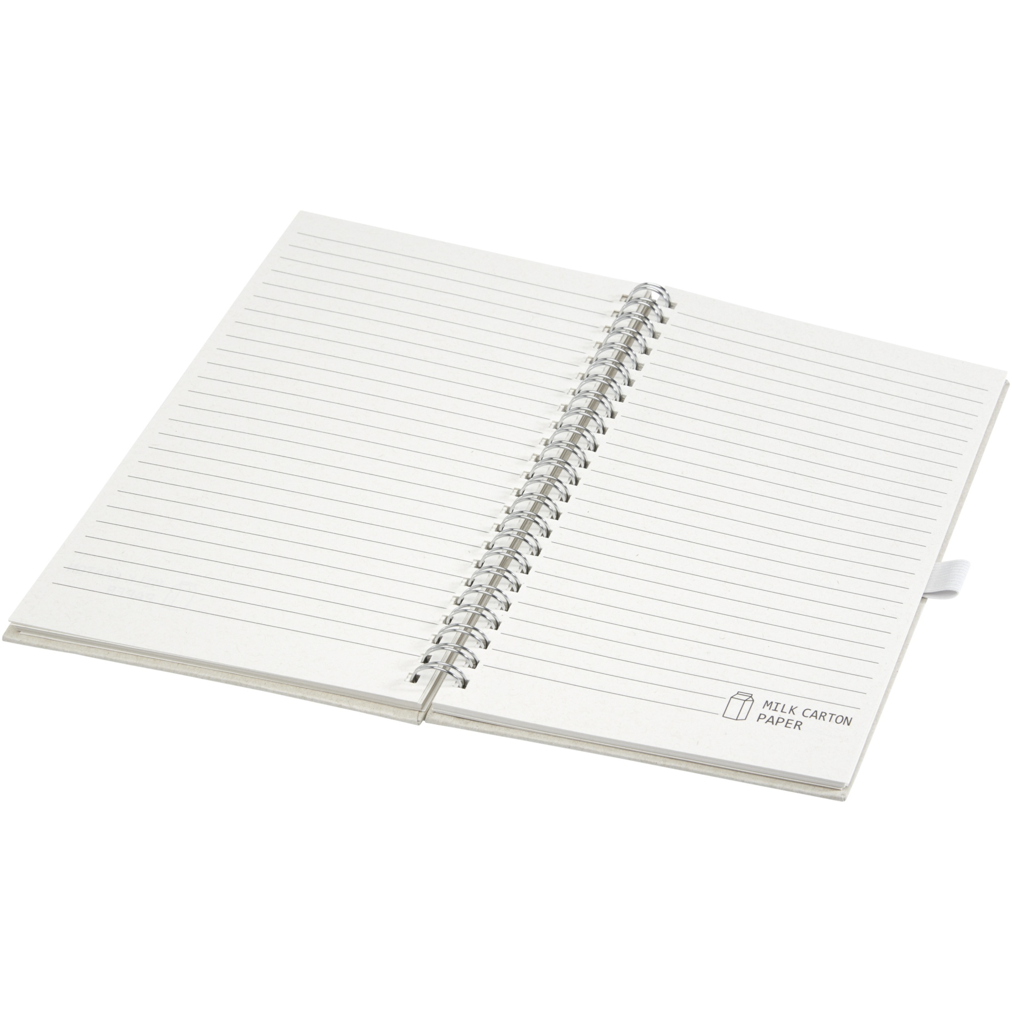 A5 size reference spiral notebook with 70 80 g/m² lined sheets, made from recycled milk cartons (up to 70%). Used milk cartons are collected, sorted, processed and turned into paper, truly turning waste into something useful.