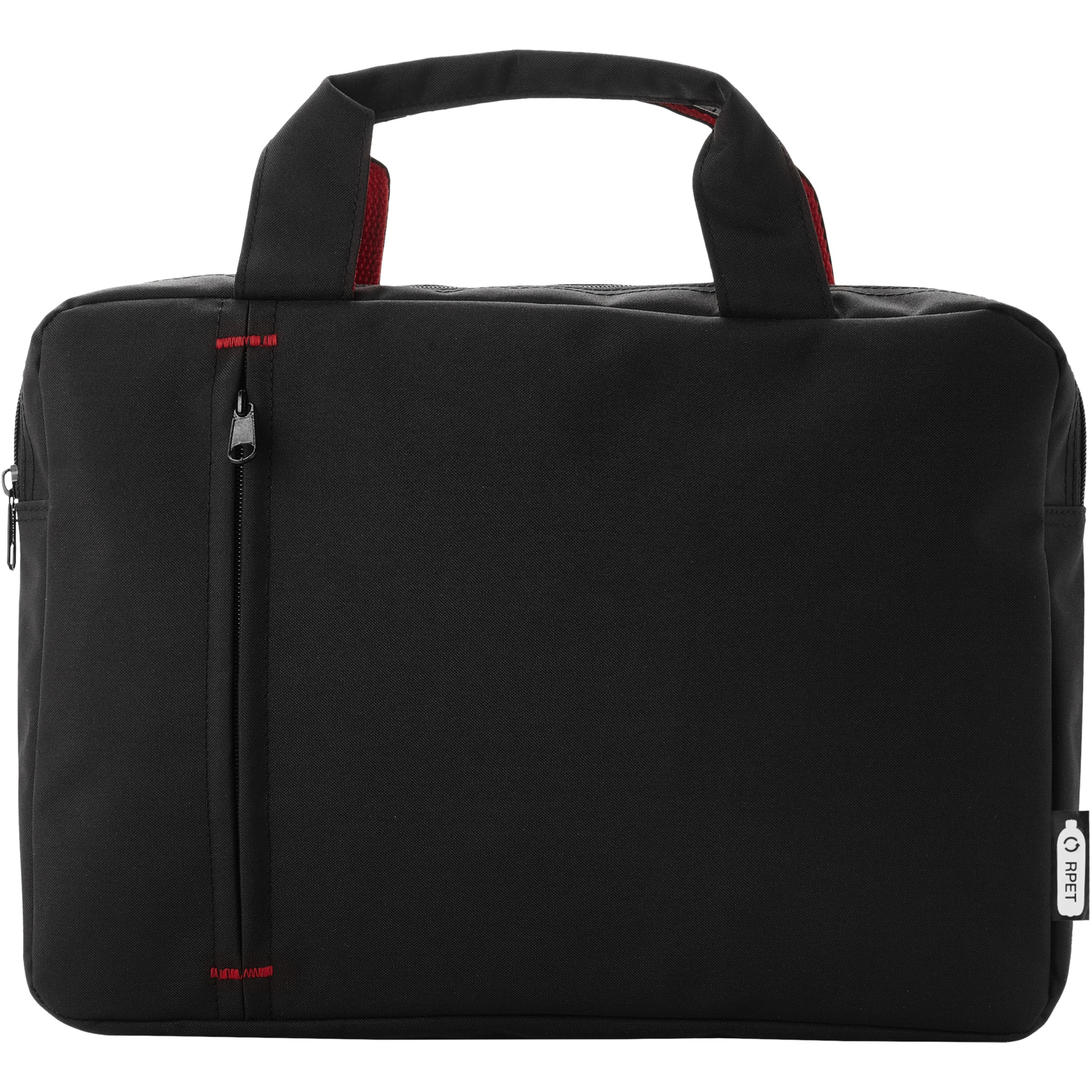 Conference bag made of recycled PET plastic featuring a zippered main compartment and front zipper pocket, with reinforced top carry handles and trendy color contrast elements.