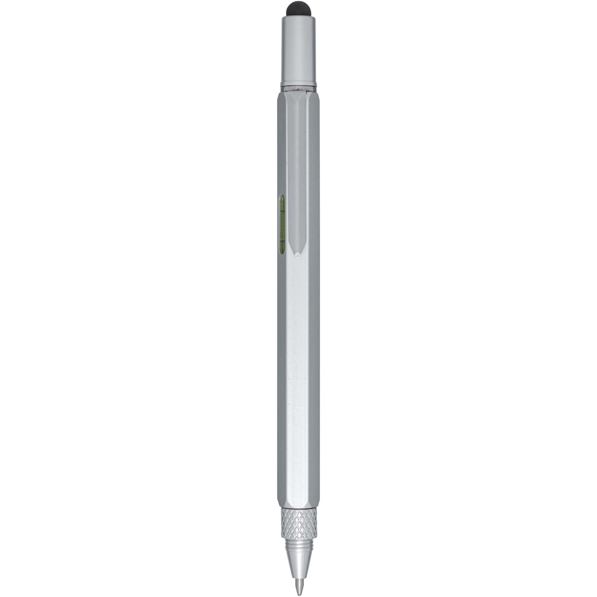 The Dora aluminium multifunctional ballpoint pen is partly made of recycled materials, and features a double sided ruler, lever, screwdriver, gradienter, and a black stylus made of rubber. The barrel is made of recycled aluminium with a silver spray coating. The clip is made of iron. The screwdriver is made of steel. The top part and tip are made of RABS. Ink colour: Black. Writing length: 400 metres. Nib size: 1.0 mm.