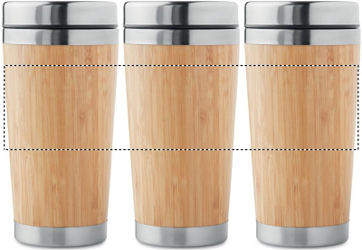 Double wall stainless steel flask with bamboo cover and PP lid. Capacity: 400 ml. Bamboo is a natural product, there may be slight variations in colour and size per item, which can affect the final decoration outcome.