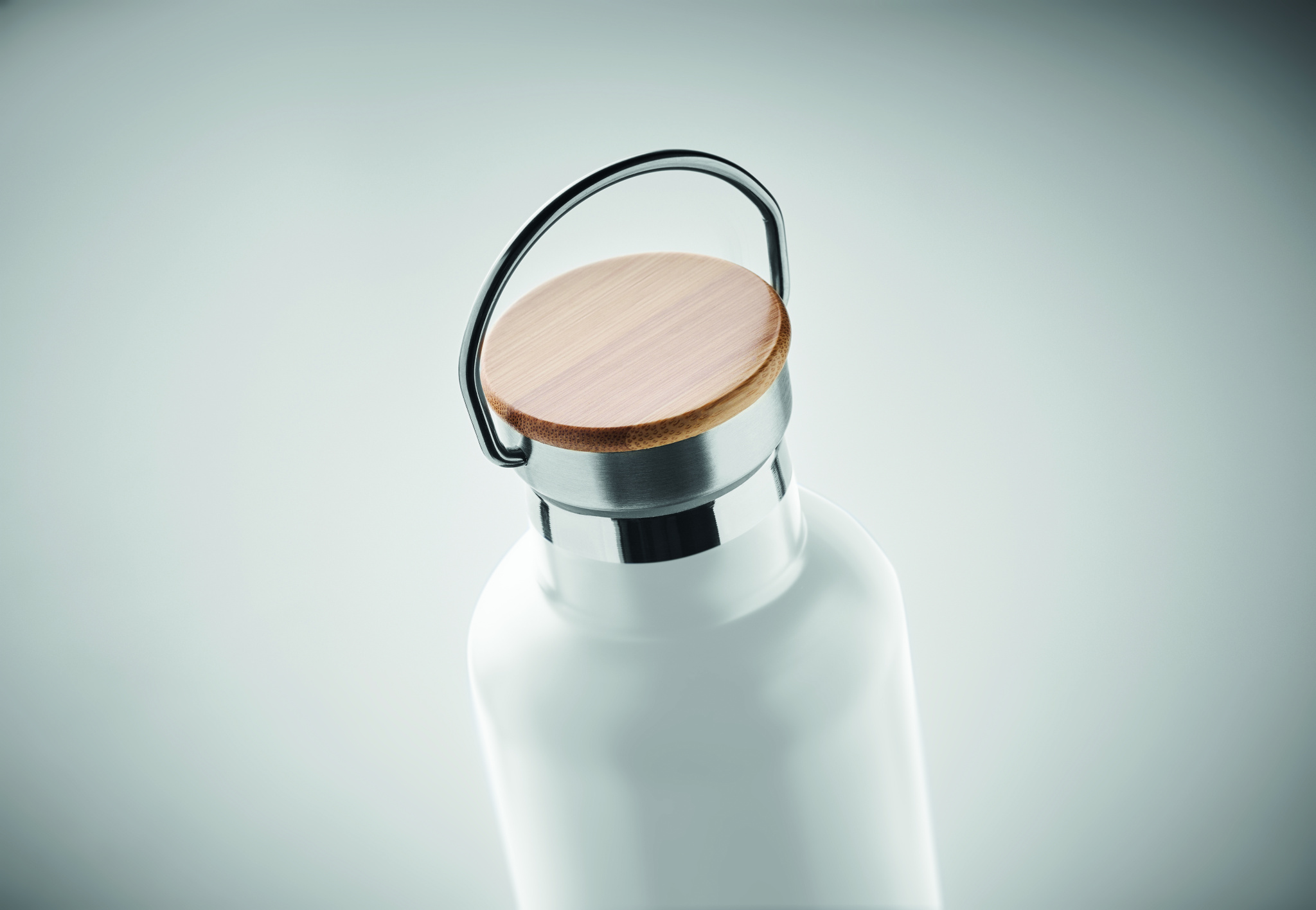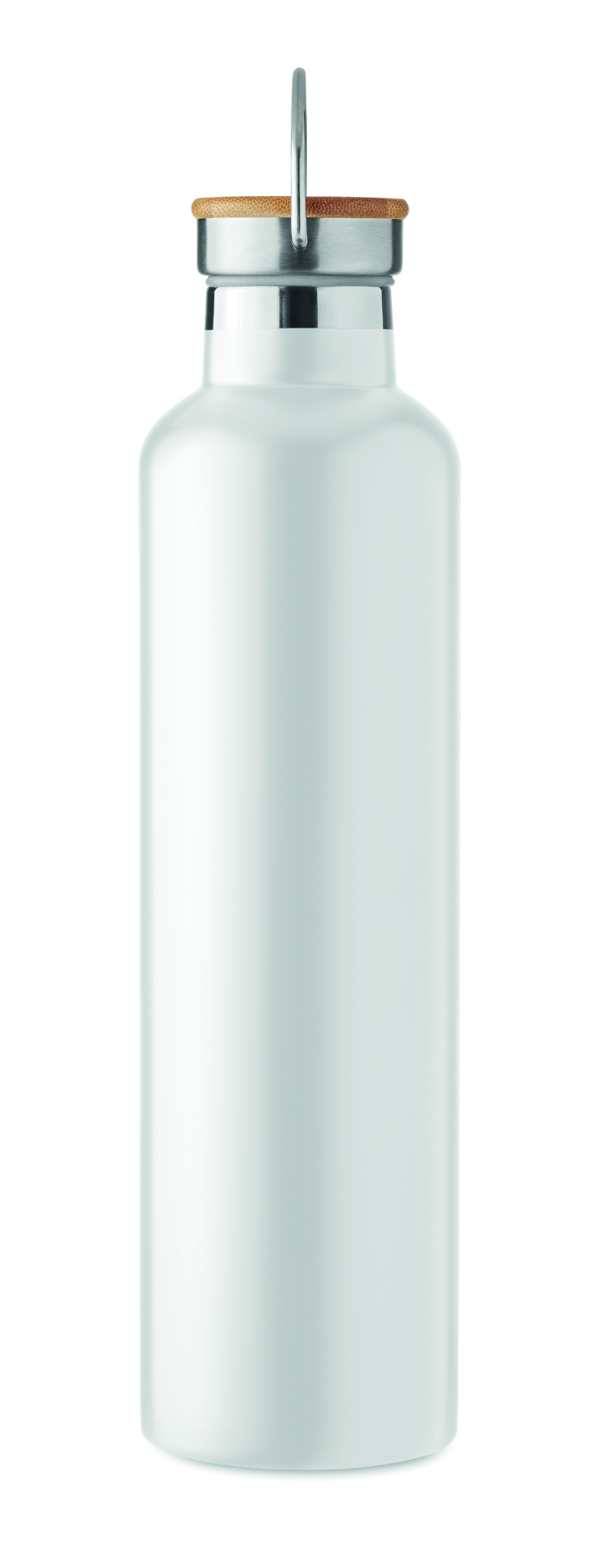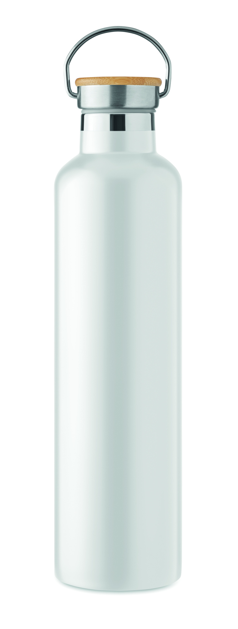 Double wall Stainless Steel insulating vacuum flask with bamboo lid and carry handle. Capacity: 1L. Bamboo is a natural product, there may be slight variations in colour and size per item, which can affect the final decoration outcome.