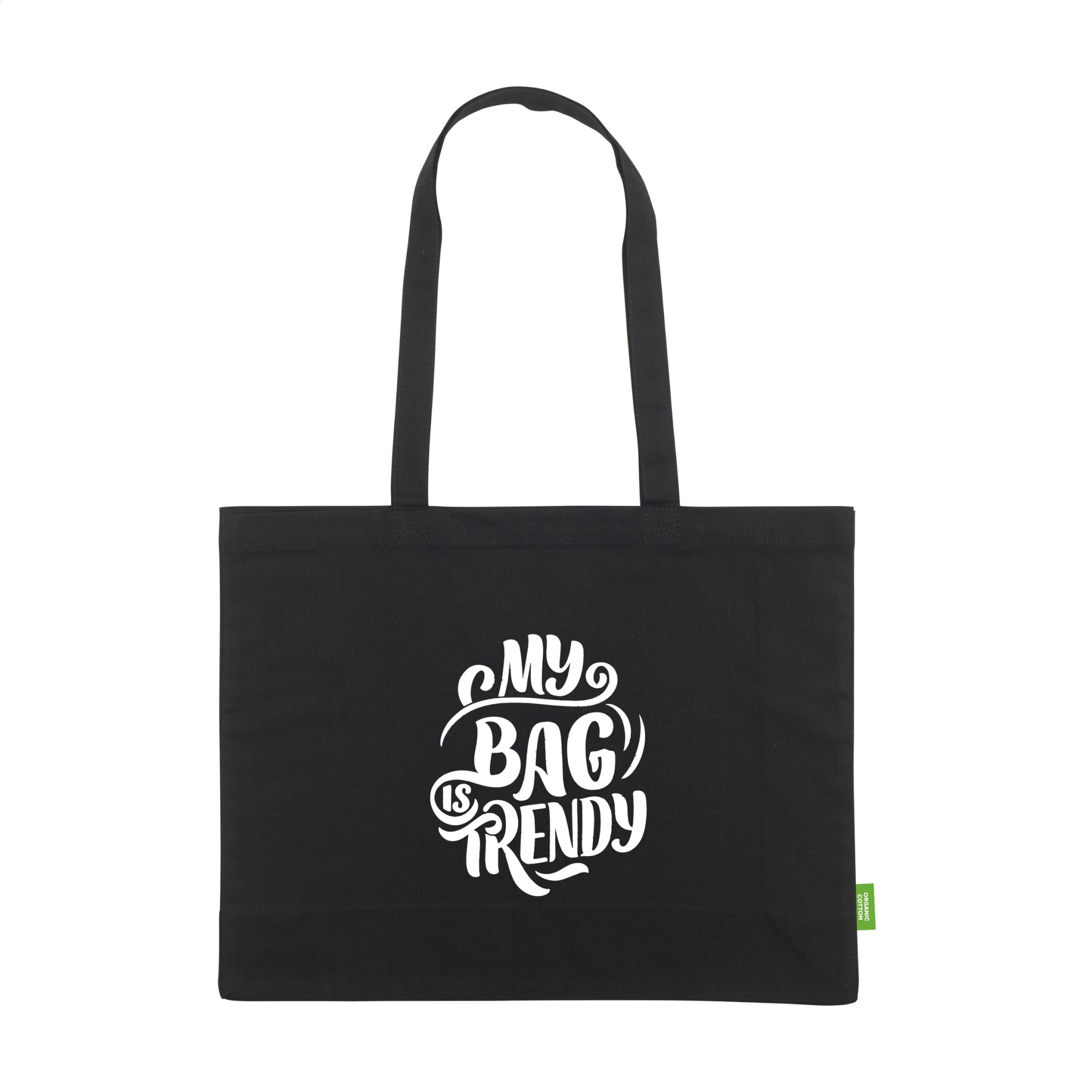 WoW! Sturdy shopping bag made from 100% organic quality cotton (180 g/m²). With long handles. Ideal for frequent reuse. GOTS-certified. Capacity approx. 19 litres.