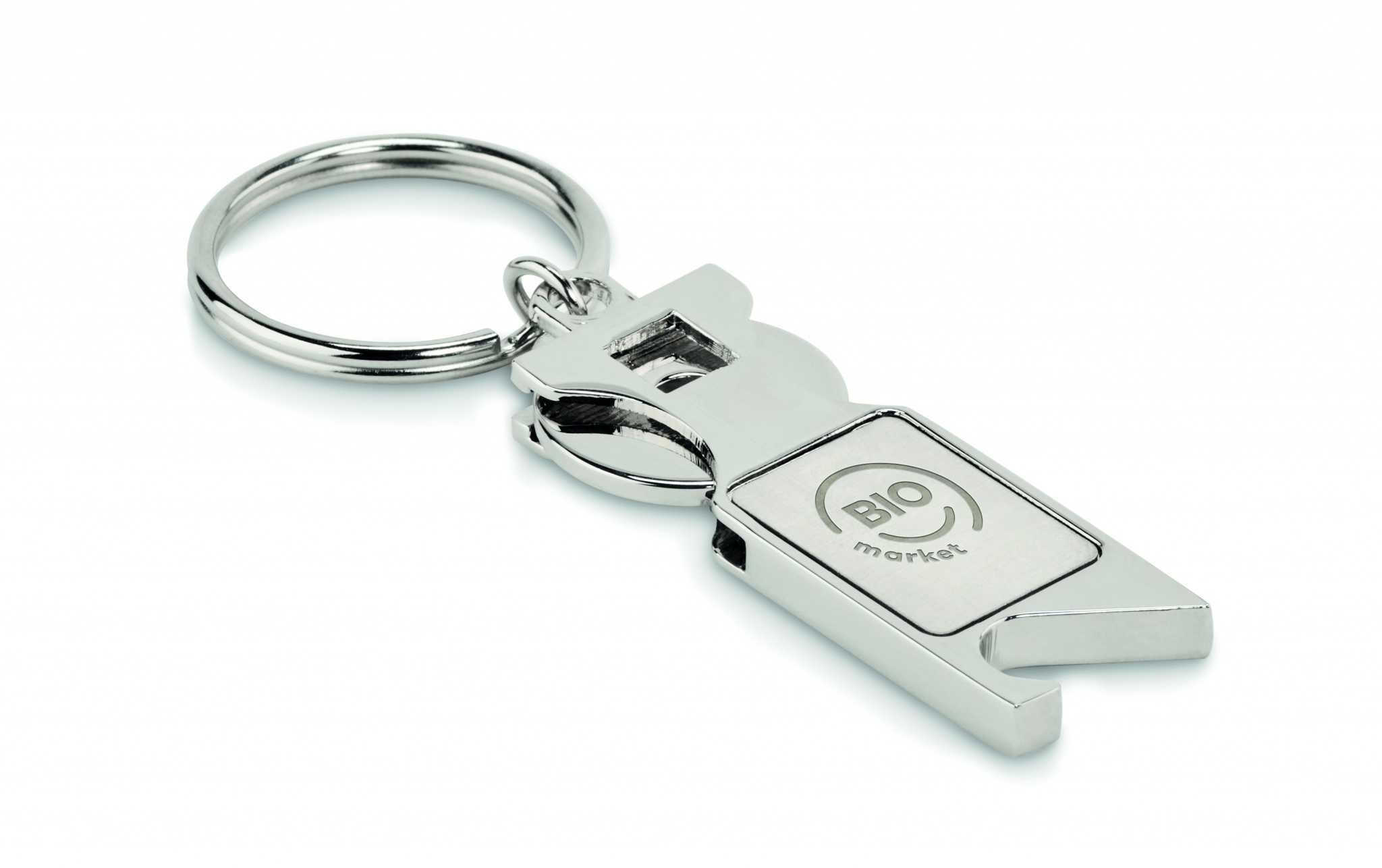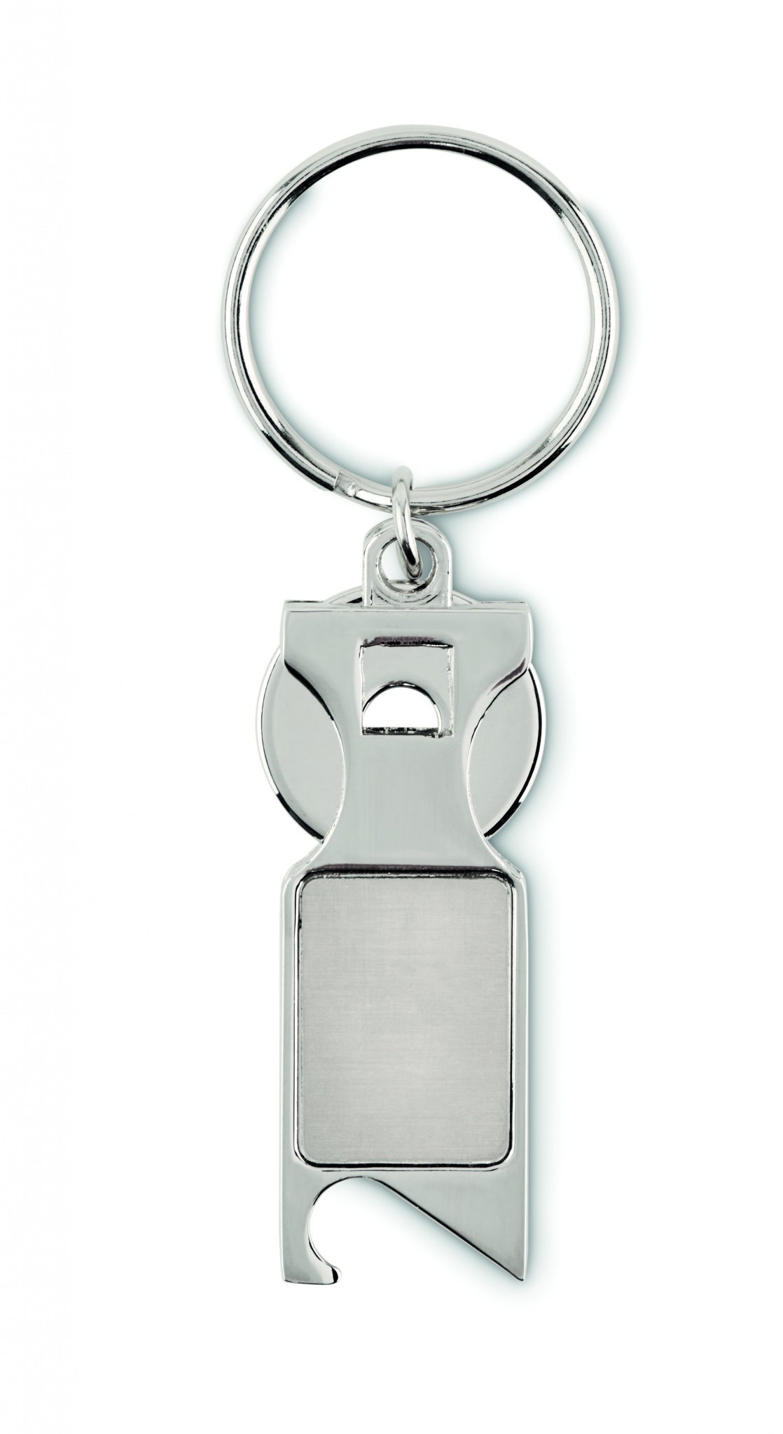 Zinc alloy key ring including euro token and bottle opener.