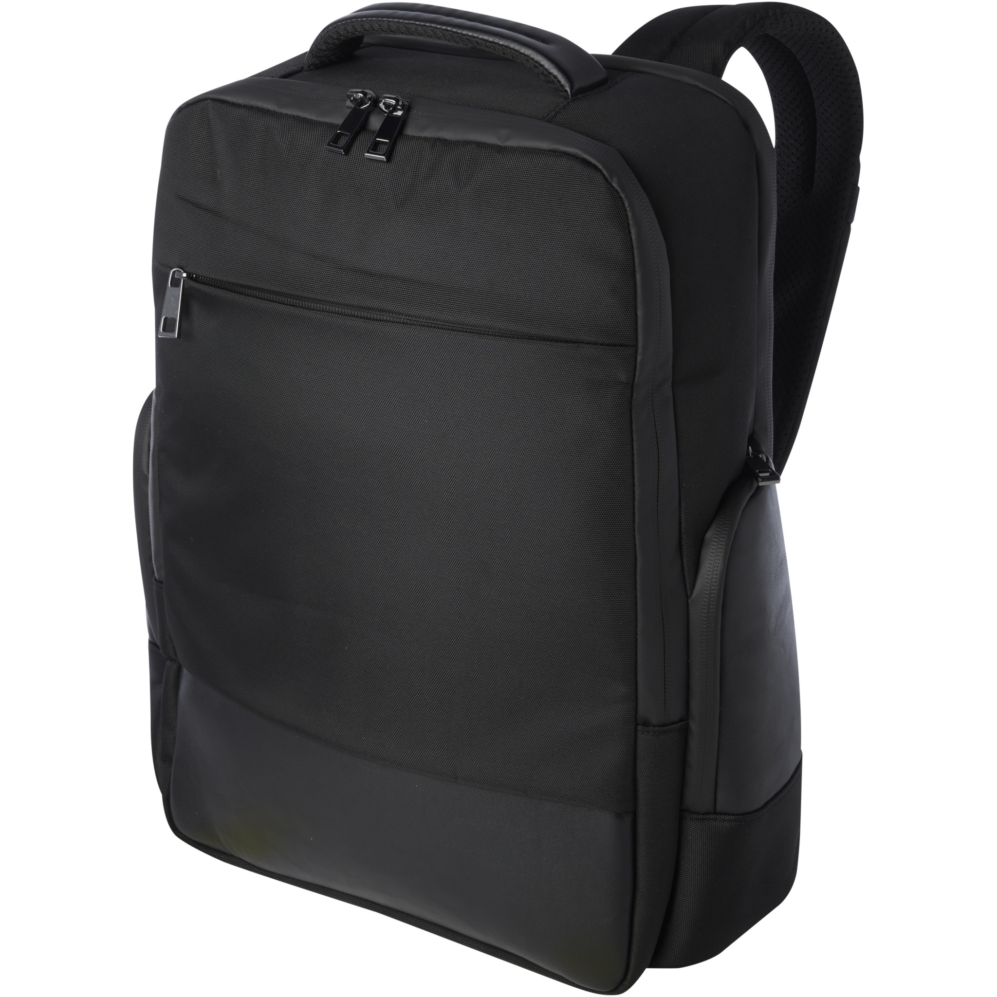 The sleek, large and sturdy GRS certified Expedition Pro laptop backpack is a perfect companion for professionals on-the-go. It is made from water repellent 900D RPET, coupled with premium PU elements and RPET lining. It features a dedicated 15.6" laptop compartment, a tablet sleeve, a spacious main compartment with integrated leak-proof pocket for toiletries, multiple organisational and side pockets, a zipped front pocket and a hidden pocket right beneath the luggage strap on the back. Constructed with padded and adjustable shoulder straps, an integrated card sleeve pocket, a sunglasses loop, moulded air mesh backing as well as a padded handle, ensuring maximum carrying comfort and convenience. Volume capacity: 25 litres. PVC free.