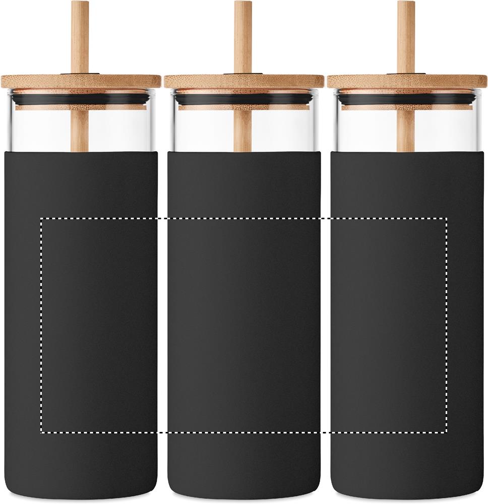 Borosilicate glass tumbler with silicone protective sleeve and with bamboo lid and straw. Capacity: 450ml. As this is a single wall mug heat transfer can still occur. Bamboo is a natural product, there may be slight variations in colour and size per item, which can affect the final decoration outcome.