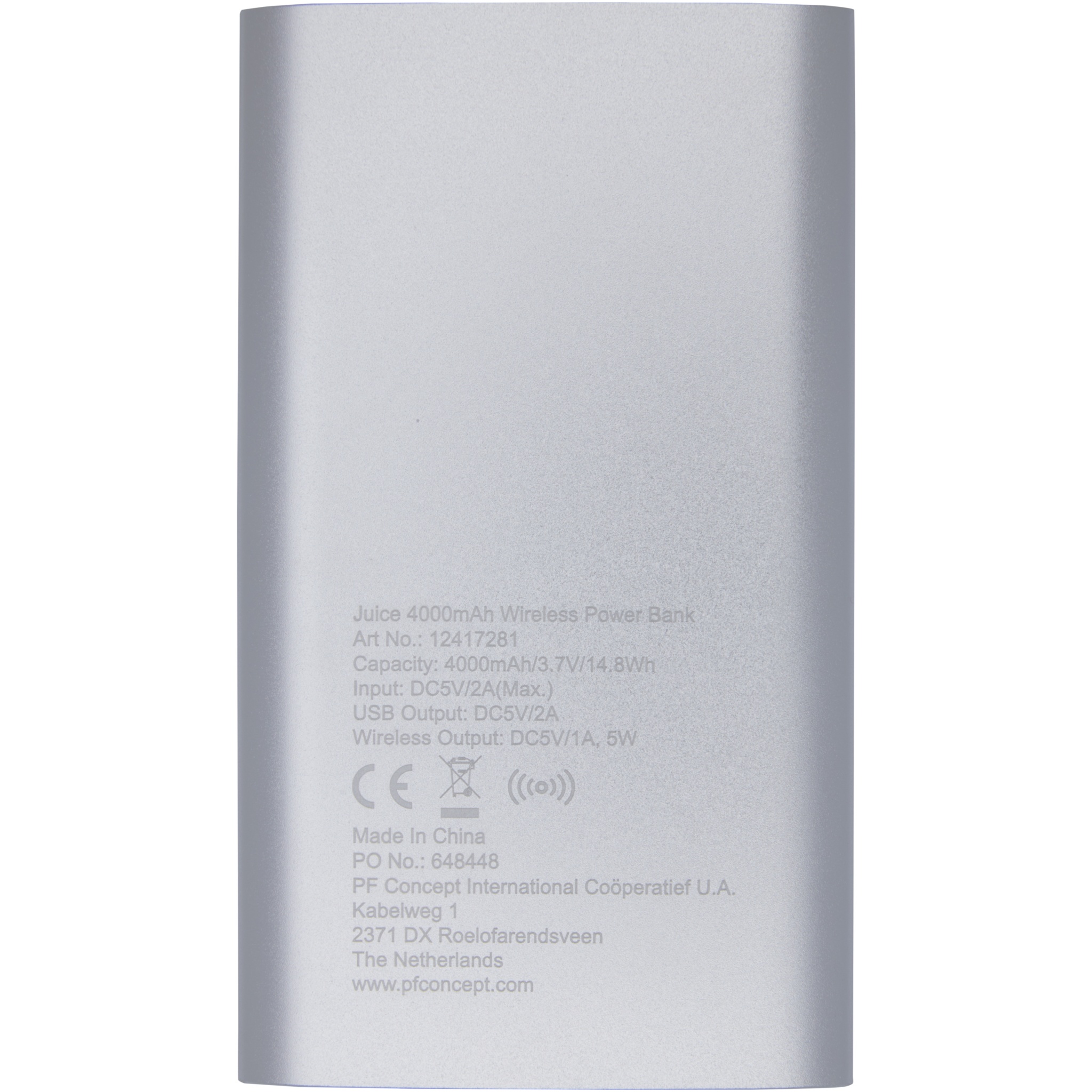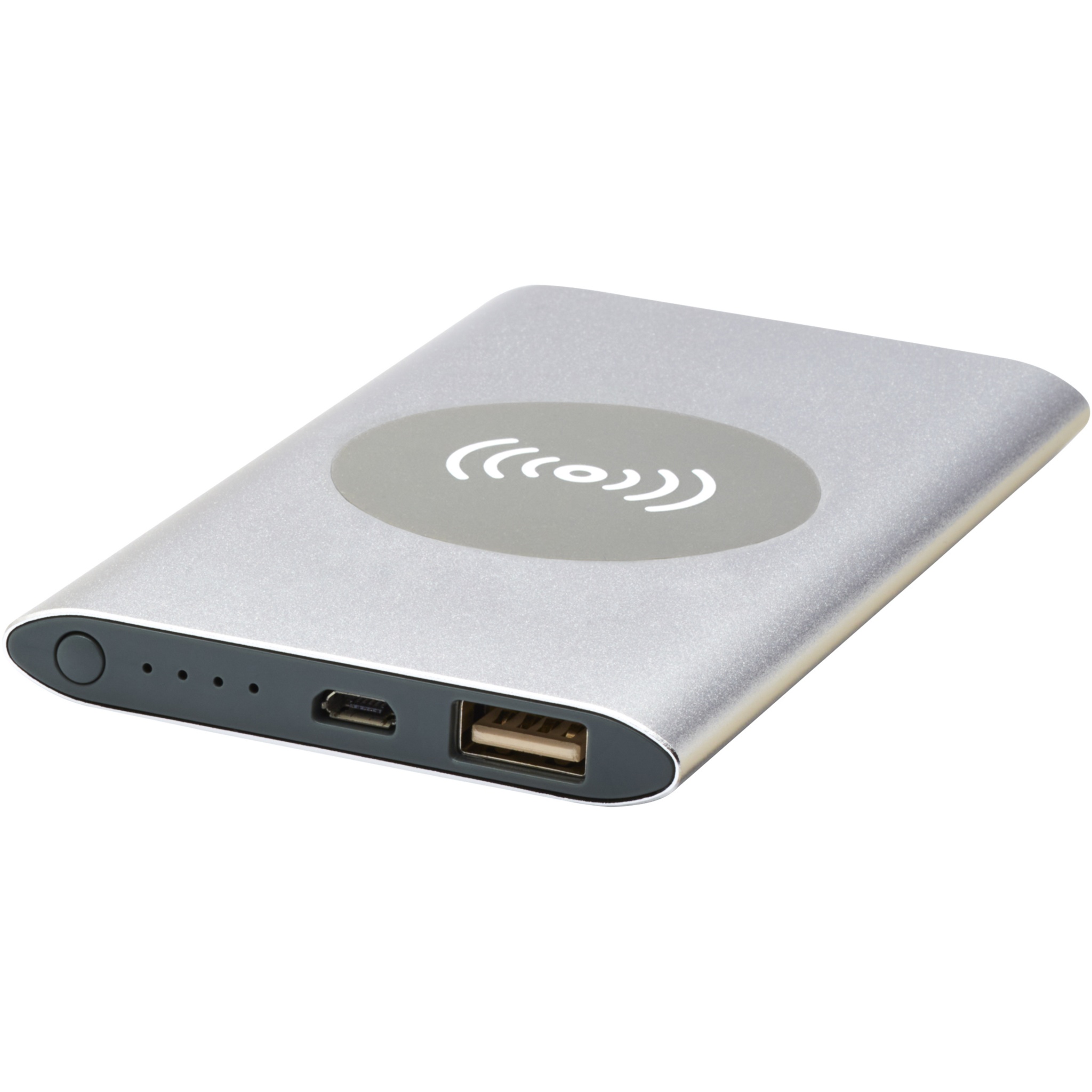 4000mAh power bank with aluminium housing. Supports 5W wireless charging and also comes with Micro USB output to enable charging by cable. With the 4000 mAh lithium polymer battery it can fully charge a smartphone. Power indicator that shows energy level at all times. Micro USB port-in: 5V/2A Output: 5V/2A. Wireless output 5W. Including PVC free TPE plastic charging cable. Delivered in a standard gift box.