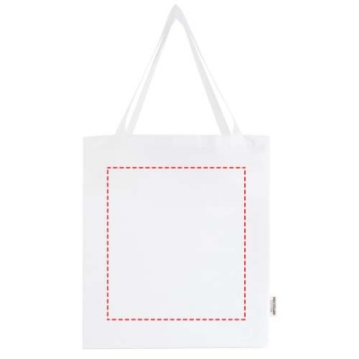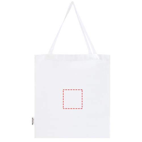 The Madras gusset tote bag made from 100% GRS certified recycled cotton is the perfect bag to give away during any event, conference or to use as a shopping bag for small groceries. The cotton density of 140 g/m² cotton makes the bag sturdy, long-lasting and suitable to carry heavy items in the main compartment. With the 30 cm long shoulder handles this tote bag is easy to carry around. The print methods available for this tote bag are also certified, making sure that the entire supply chain is transparent and certified. Made in India. Resistance up to 5kg weight.
