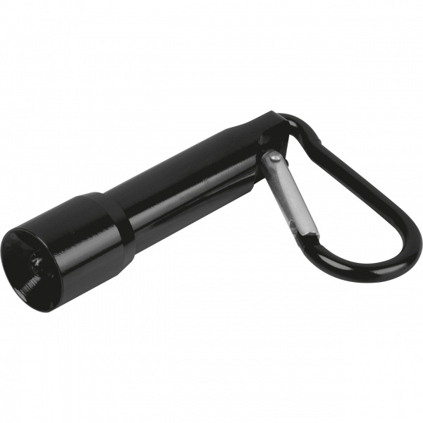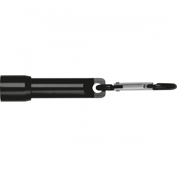 Mini flashlight with carabiner hook made from recycled aluminum. Includes 4 button cell batteries. Your logo is applied to the flashlight using laser engraving.