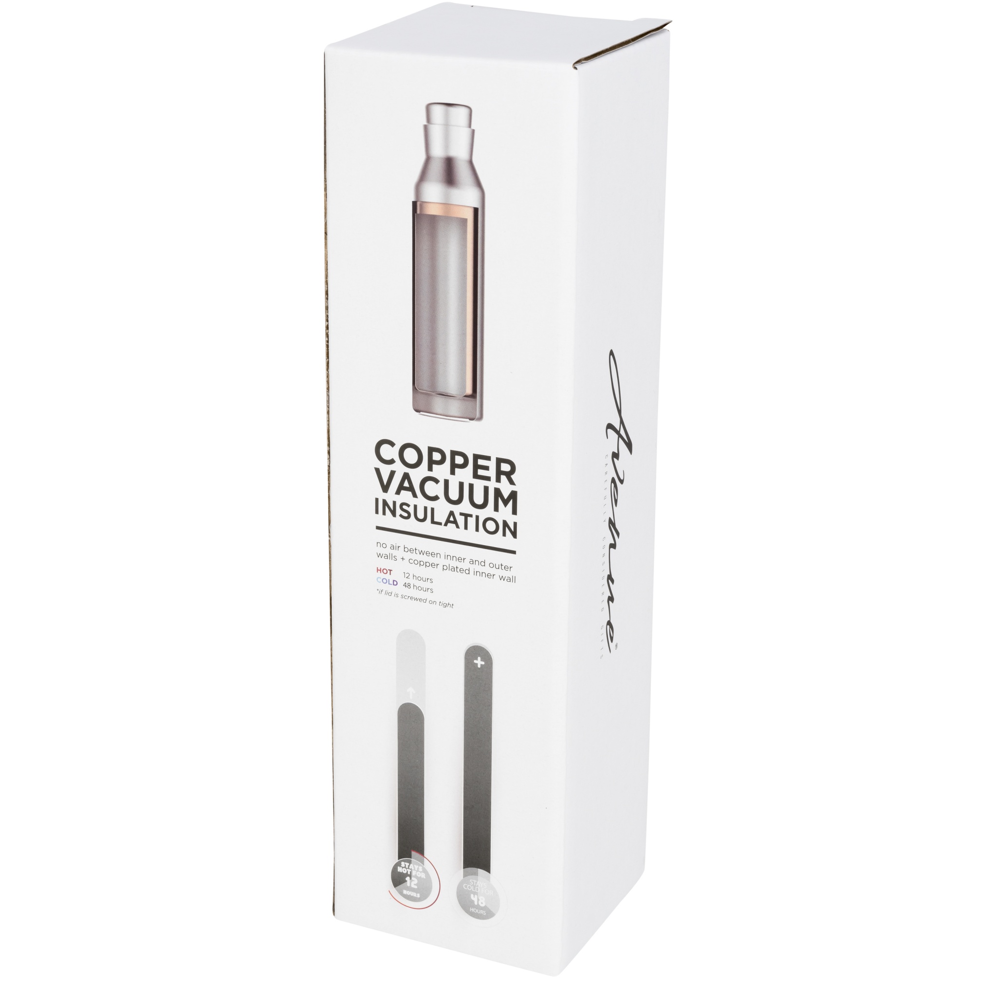 Durable, double-wall stainless steel vacuum construction with copper insulation, which allows your beverage to stay hot for 12 hours and cold for 48 hours. The construction also prevents condensation on the outside of the bottle and the lid is spill resistant. Features innovative screw-on lid with cork-look. Fits most standard car cup holders. Volume capacity is 590ml. Presented in an Avenue gift box.