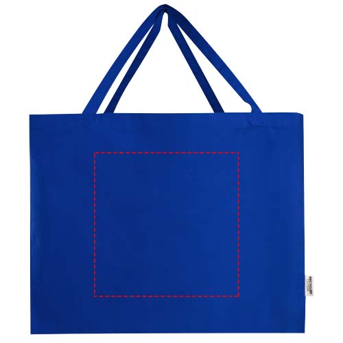 The oversized Odessa tote bag made from 100% GRS recycled cotton is designed for comfortable carrying with its 30 cm long shoulder handles and extra large main gusset compartment. Whether it is to carry around heavy books or groceries, this bag is designed to cover all needs. Print methods available for this tote bag are also certified, making sure that the entire supply chain is transparent and certified. The 220 g/m² cotton ensures durability and reliability, giving the bag a resistance of up to 10 kg weight. Made in India.