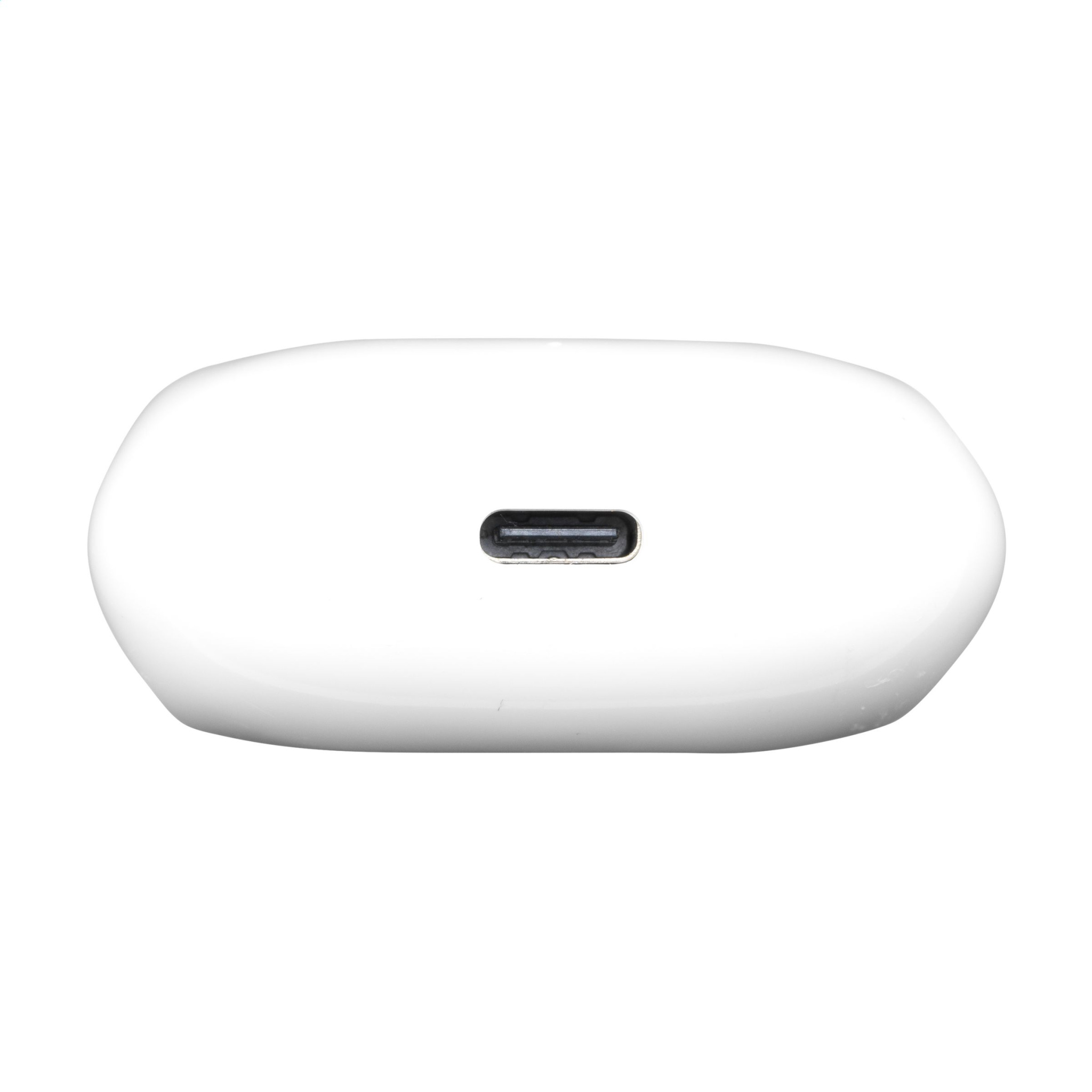 Next generation true wireless earphones in charging case made from recyced ABS. These earphones use BT 5.1 for a smooth connection. The earphones have a 30mAh battery and take only one hour to charge with the 200mAh charging case. Excellent sound reproduction and adjustable volume is coupled with autopairing technology providing automatic pairing and touch control. Easily make hands-free phone calls and enjoy music without restrictive cables. Connection has a 10-meter range. Includes a PVC-free charging cable type-C and user manual. RCS-certified. Total recycled material: 62.5%. Each item is individually boxed.