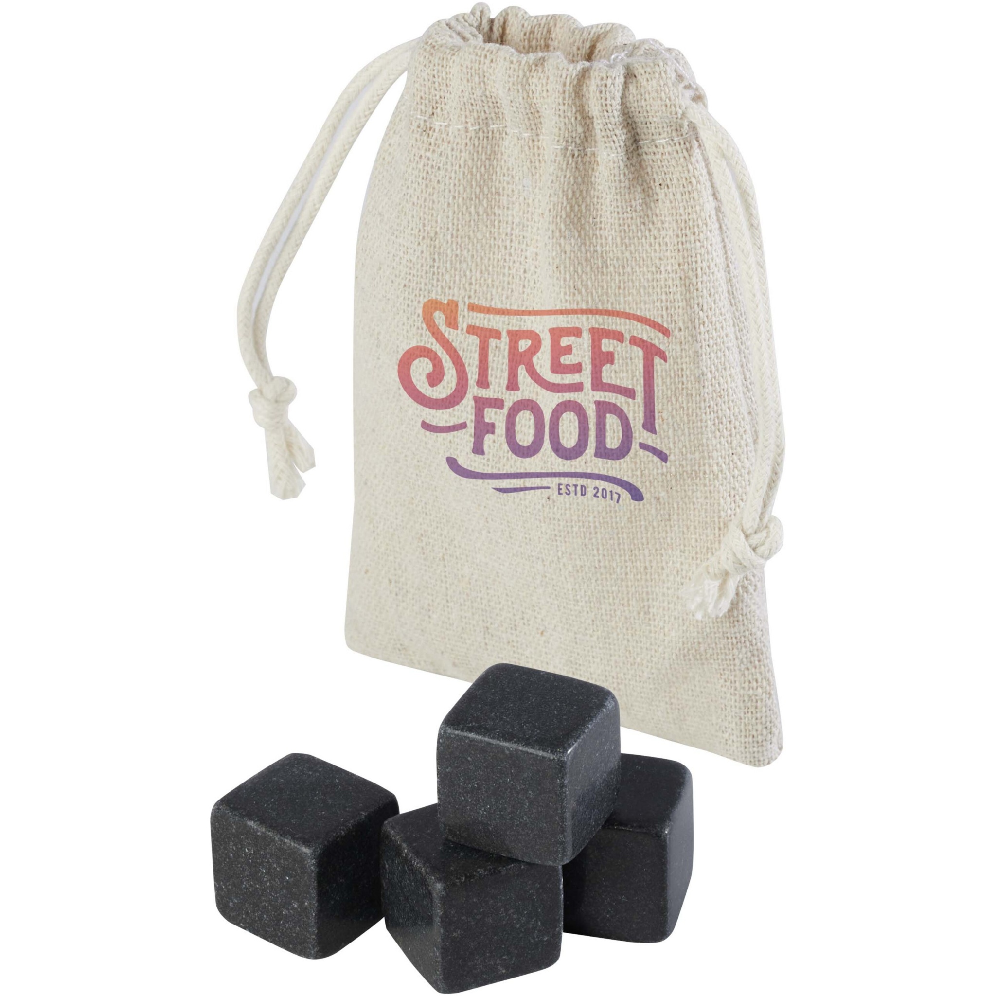 Set of 4 reusable stone ice cubes delivered in a linen pouch. These cubes chill drinks quickly and effectively, all while preserving the flavour.