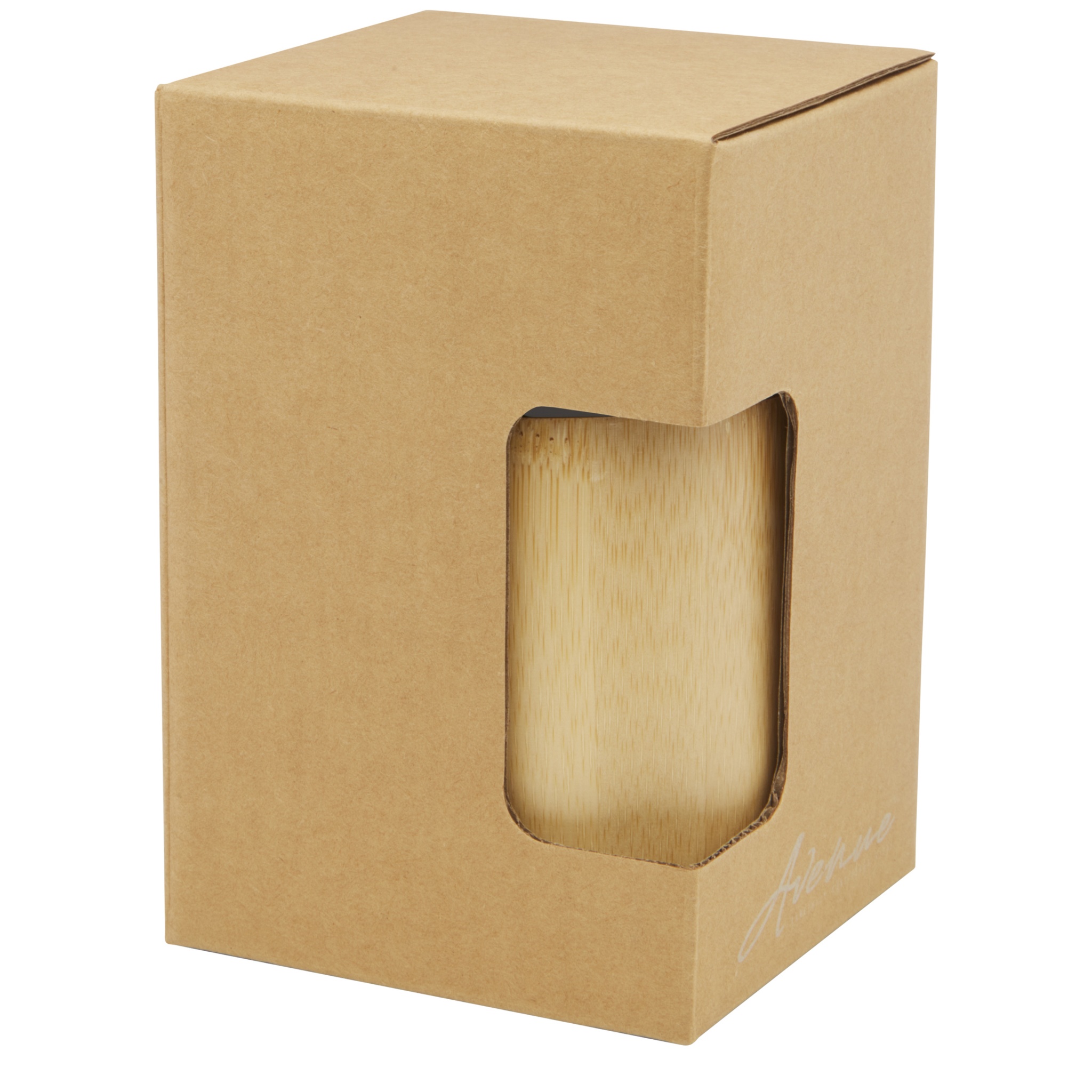 Stylish porcelain mug with organic bamboo exterior which provides a natural look and comfortable grip. The Pereira mug features a push-on spill-proof slide-lock lid and is BPA Free. Volume capacity is 320 ml. Handwash recommended. Presented in a recycled cardboard gift box.