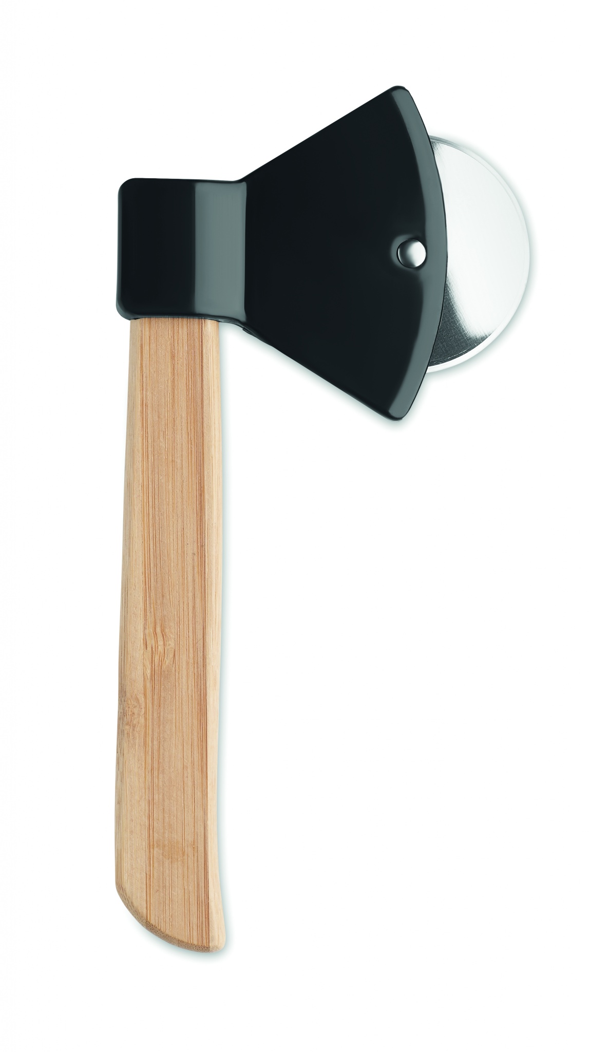 Axe shaped pizza cutter with bamboo handle. Bamboo is a natural product, there may be slight variations in colour and size per item, which can affect the final decoration outcome.