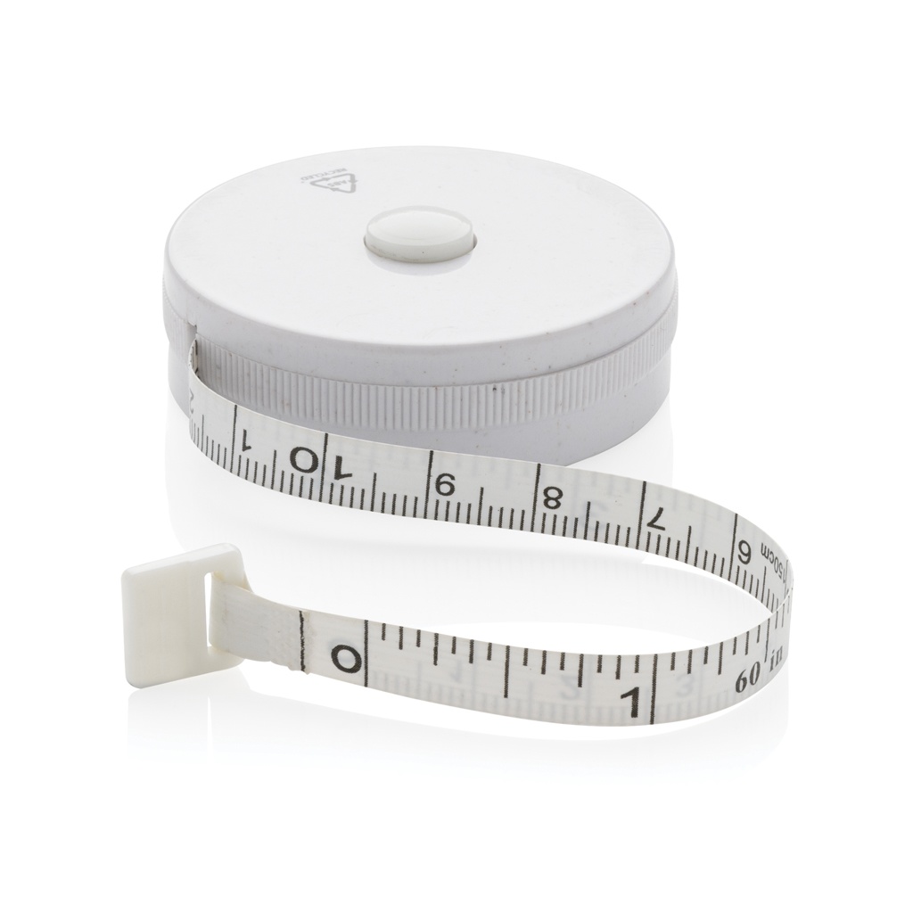 1.5m/60inch recycled plastic tape with return push button, for fitness and fashion. The case is made out of RCS certified recycled ABS plastic, fibreglass and FSC® 100% bamboo. Total recycled content: 64% based on total item weight. RCS certification ensures a completely certified supply chain of the recycled materials. The tape is 8mm wide and retractable by button. Packed in FSC® mix packaging.