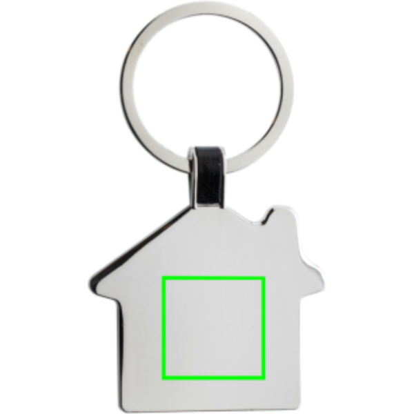 House shaped keychain made from RCS recycled zinc alloy. Total recycled content: 84% based on total item weight. RCS certification ensures a completely certified supply chain of the recycled materials. Packed in paper bag.