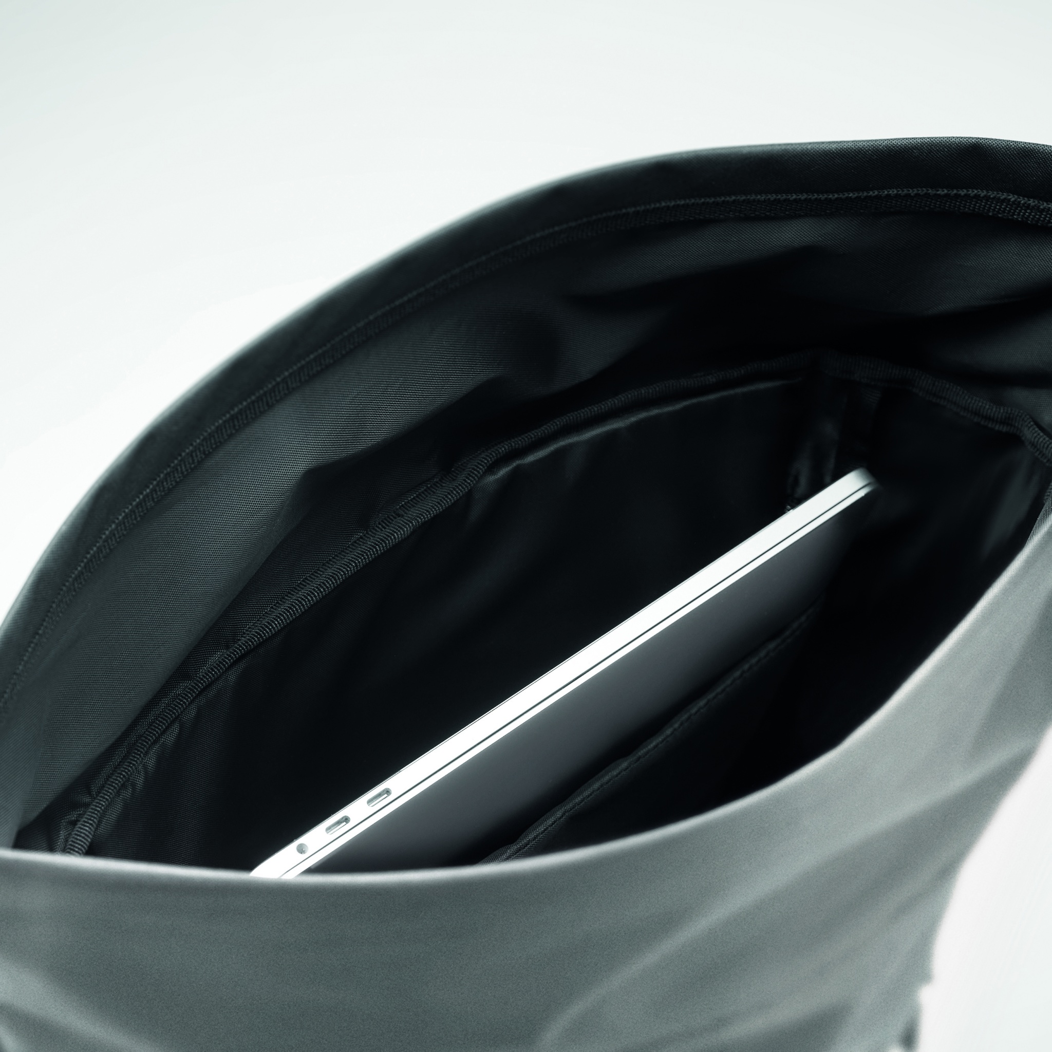 15 inch laptop rolltop backpack in high reflective 190T polyester. Additional internal side with hook and loop closure. Padded back, straps and bottom. Front sided zippered pocket. Bottom part in 600D recycled polyester.