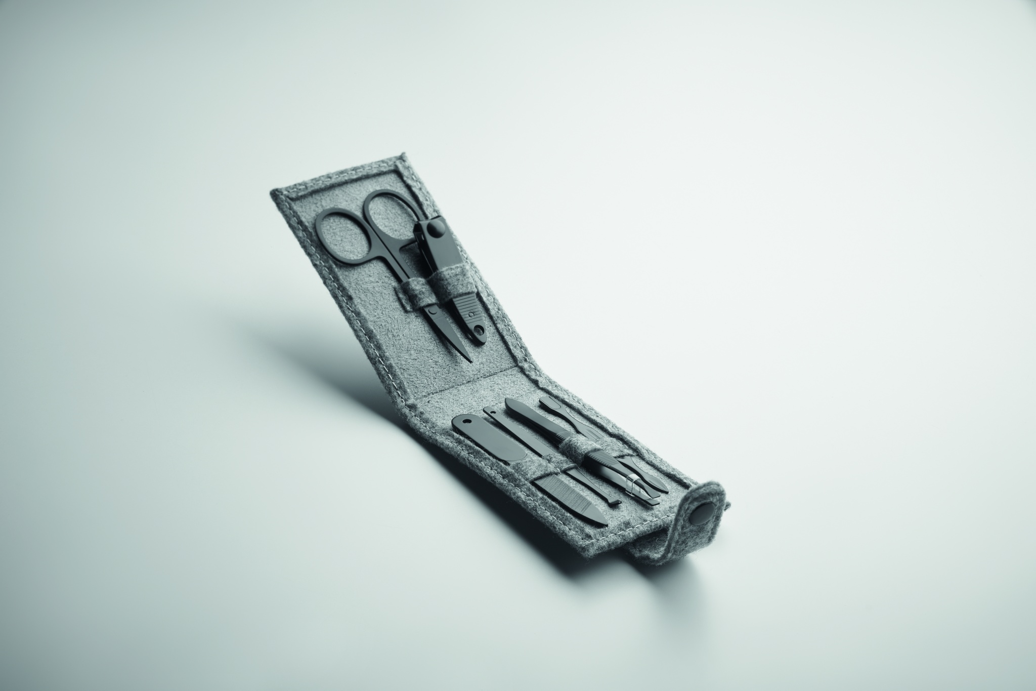 6 piece stainless steel manicure set in rectangular RPET felt pouch.