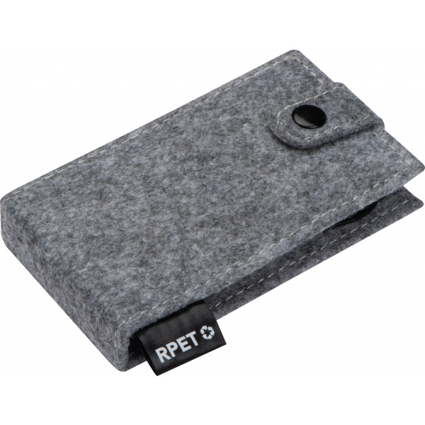 Attractive manicure set made of felt (recycled PET). It includes nail scissors, a nail file, nail clippers, tweezers and two cuticle pusher. We place your logo on the front of the case.
